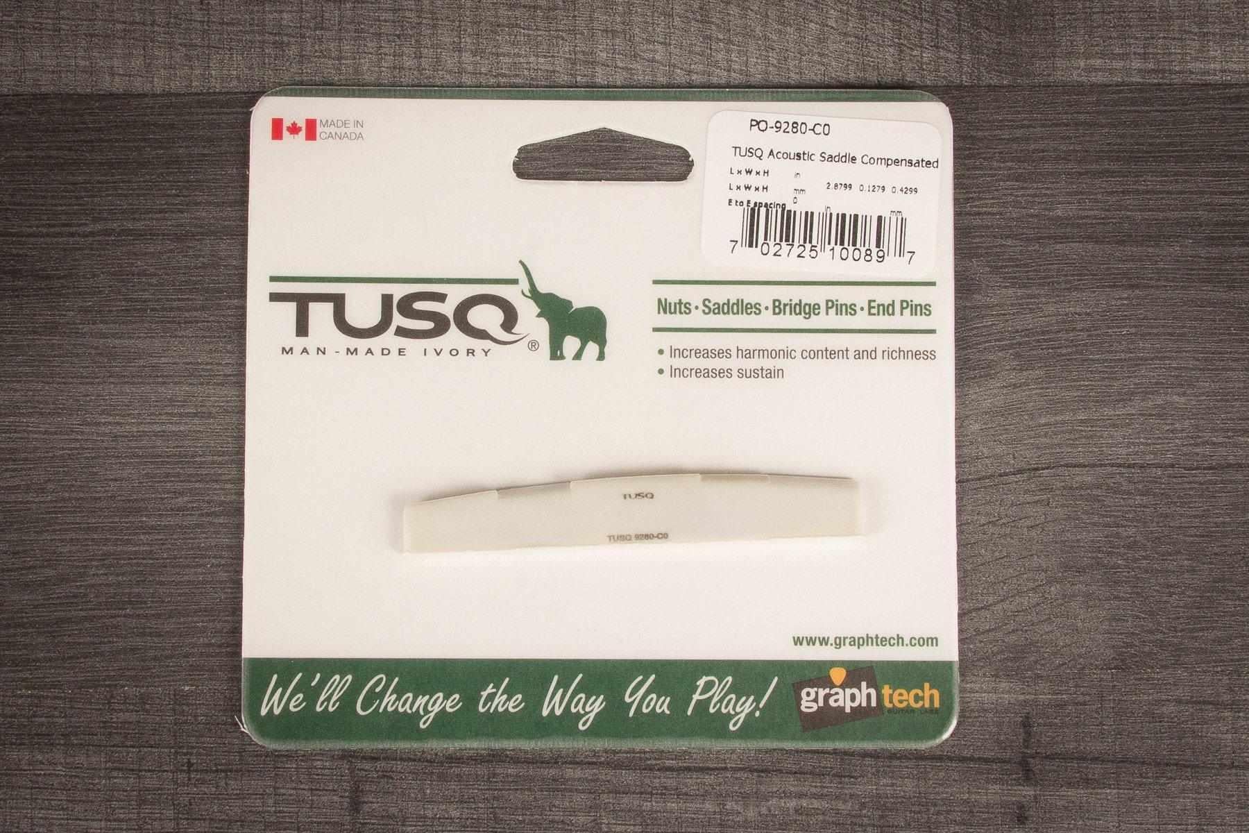 The PQ-9280-C0 is a great option to replace or upgrade the saddle on your acoustic guitar. It is our most popular saddle and will work with many other guitars. It 1/8" thick and is compensated to help improve the playability of your guitar. TUSQ delivers a rich tone, crystal clear bell like high end with big open lows and a significant increase in harmonic content and harmonic sustain. Increase harmonics equals more richness and character in your tone. Its the difference between a four piece choir and a twelve piece choir singing every time your play a note. Dimensions: 73,15 x 3,25 x 10,92 mm.