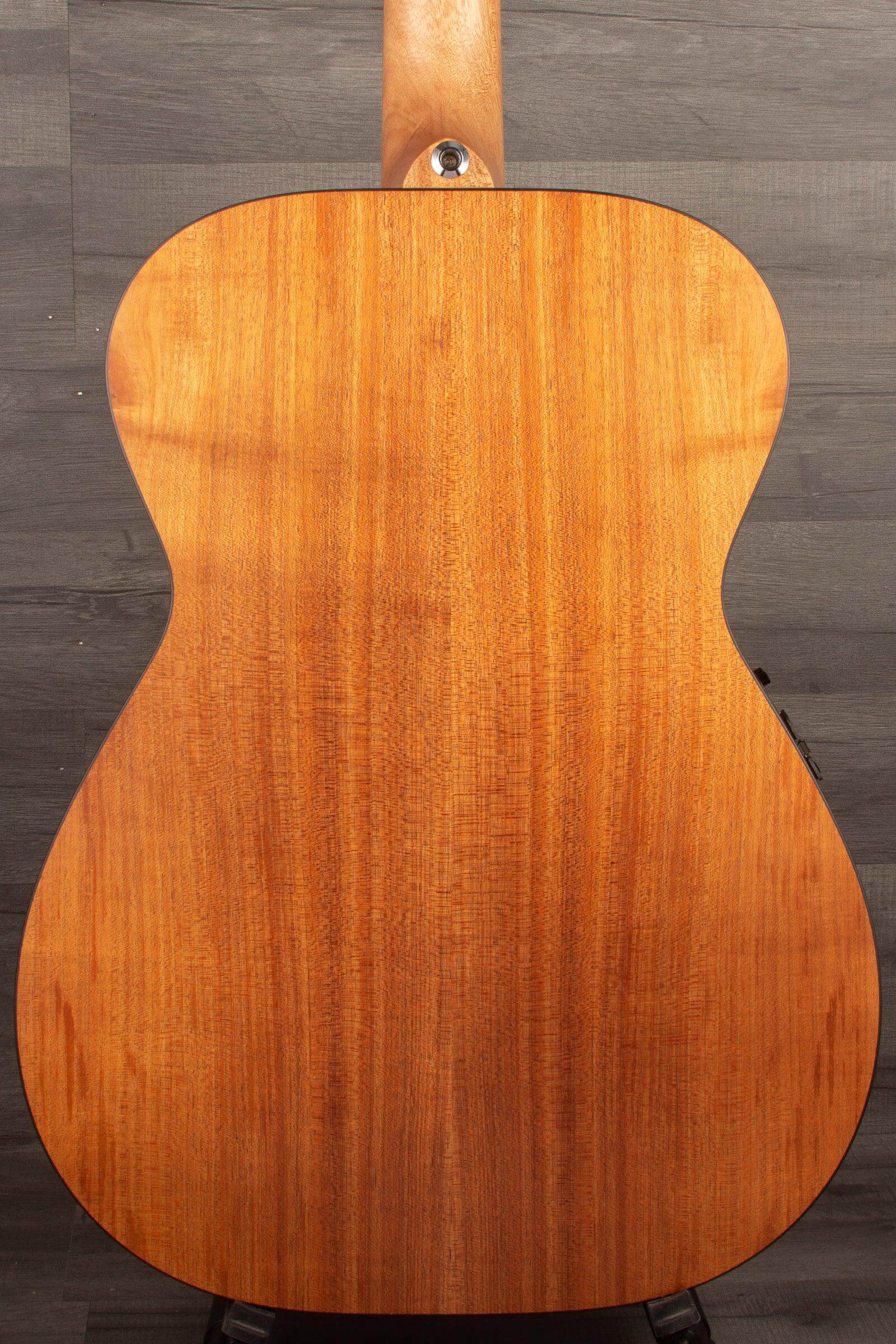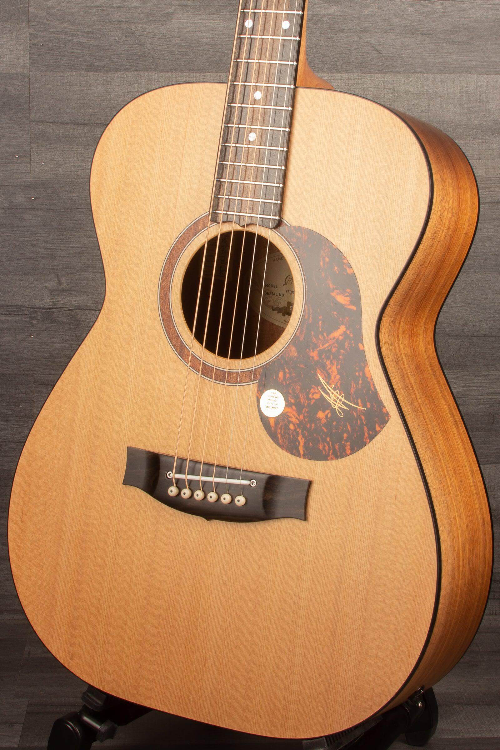 Solid Blackwood back and sides and a Western Red Cedar top. The Maton SRS 808 is a beautiful little guitar and combines the warm, full tones of Blackwood with the top end sparkle of Cedar.