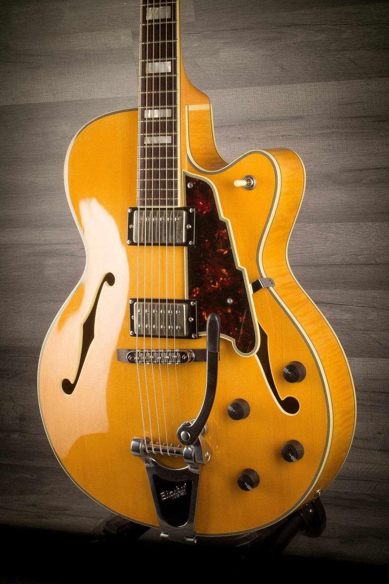 Strapped with a Bigsby vibrato and high-output Kent Armstrong pickups, the Excel 175 is an archtop built for modern rock. Its fully-hollow 16-inch-wide body is perfectly balanced and pours out robust tone. The 175 is paired with a stunning chrome Bigsby, allowing for classy shimmers and warped bends -- all while its roller bridge guarantees stable tuning. Exceptionally crafted, the Excel 175 joins the ranks of legendary vibrato-equipped archtops.