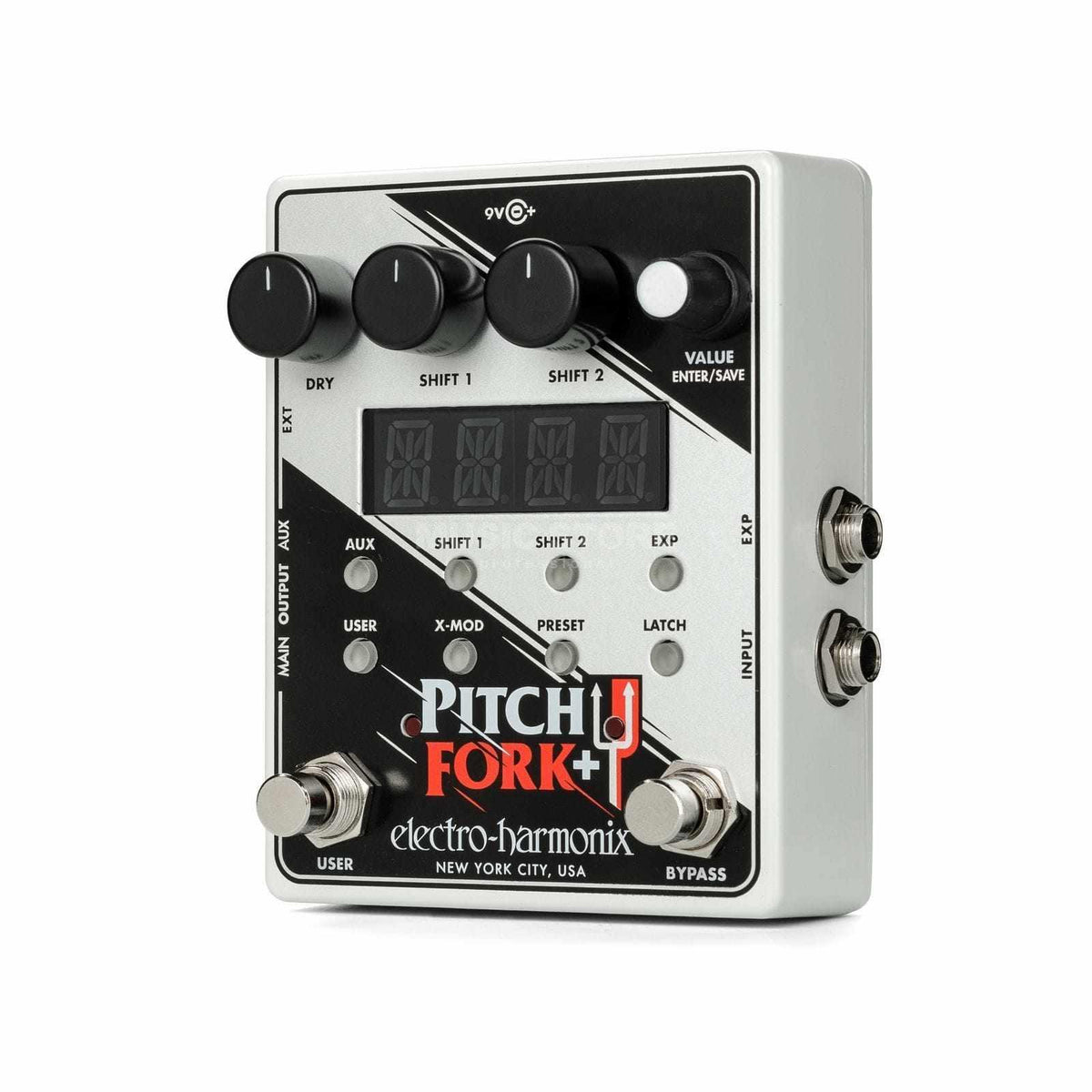 With the Electro Harmonix Pitch Fork + the New York effect company sends a powerful dual pitch shifter with versatile sound and routing options into the race. Two independent pitch engines not only allow you to shift the played note up or down by up to three octaves, but also to detune it by up to 99 cent. The X-MOD mode also provides authentic Rind modulator or frequency modulation sounds. Here the pedal convinces with an extremely precise and polyphonic tracking, so that even complex chord voicings are easily recognized by the Pitch Fork +. Three volume controls allow you to adjust the ratio between the original signal and the pitch engines. The aux output of the Electro Harmoix Pitch Fork + also allows for versatile signal routing, while the EXT and EXP connectors accommodate connection to optionally available expansion footswitches or expression pedals. In addition to the bypass footswitch, which features both latching and momentary modes, the Electro Harmonix Pitch Fork Plus is also equipped with a programmable user footswitch.