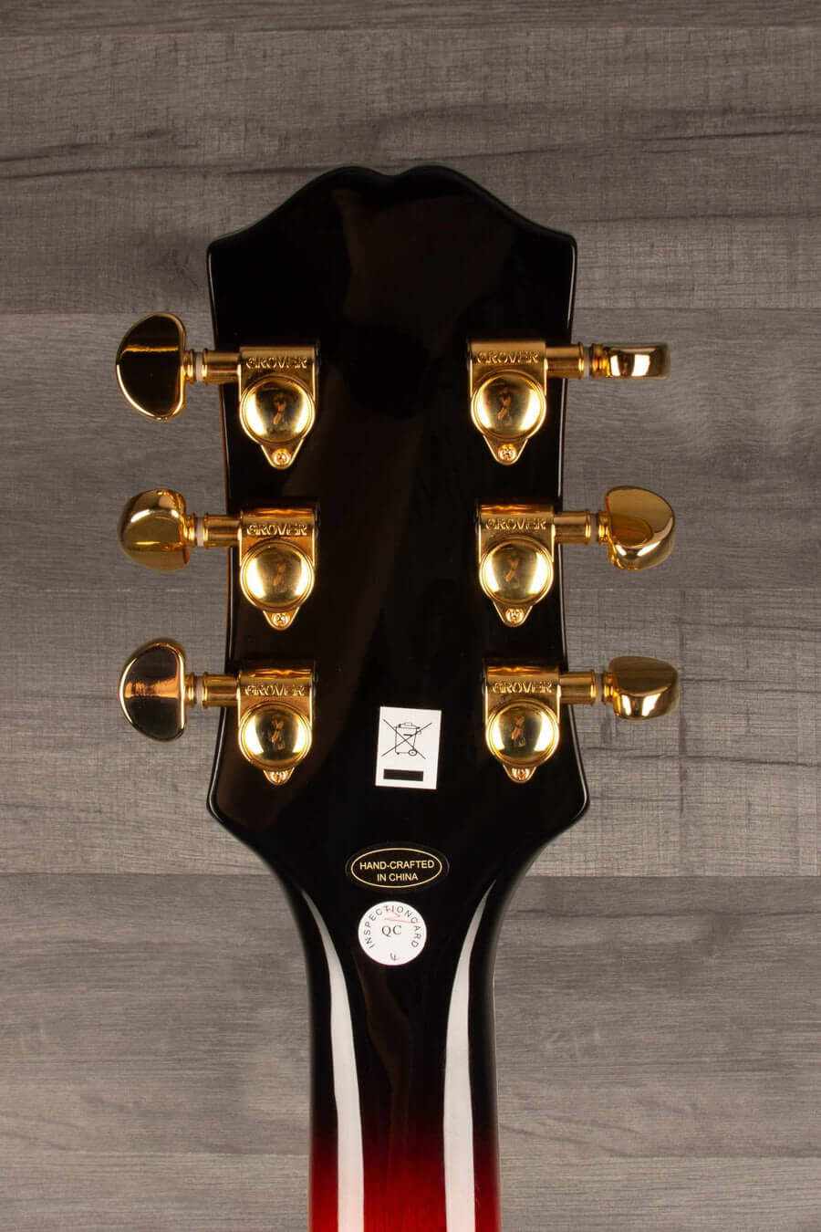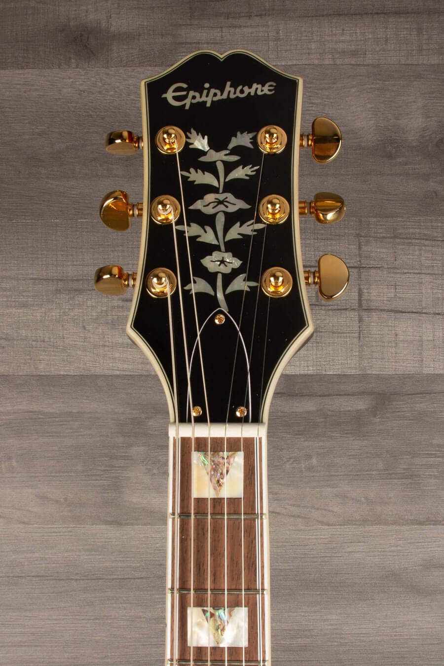 Epiphone's well-known Sheraton guitars have made a resurgence - featuring a semi-hollow body consisting of a Maple and centerblock construction for feedback reduction. The Mahogany neck is inlaid with a 22-fret Indian Laurel fingerboard, containing block mother of pearl and triangular abalone inlays. Furthermore, the headstock boasts the vintage Epiphone logo and a captivating mother of pearl Tree of Life inlay.