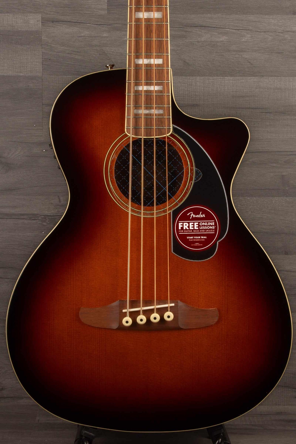 Crafted with an X-braced solid spruce top and sapele back and sides, the compact mid-sized auditorium body of the Kingman™ Bass produces a deep, punchy, and articulate tone and features a cutaway for convenient access to the upper frets. The bound nato neck is elegantly appointed with block inlays and is designed with a slim "C"-shaped Jazz Bass® profile, an easy-to-play short 30" scale length, comfortable 1.5" nut width, and a 4-in-line headstock for a distinctive look born from Fender's electric bass DNA. Other notable details include open-gear vintage-style tuning machines for smooth, accurate tuning, a GraphTech® NuBone® nut and saddle for focused fundamental tone, and a Fishman® Presys preamp system that allows detailed fine-tuning of the bass's amplified sound when performing or recording. A deluxe gig bag is included.