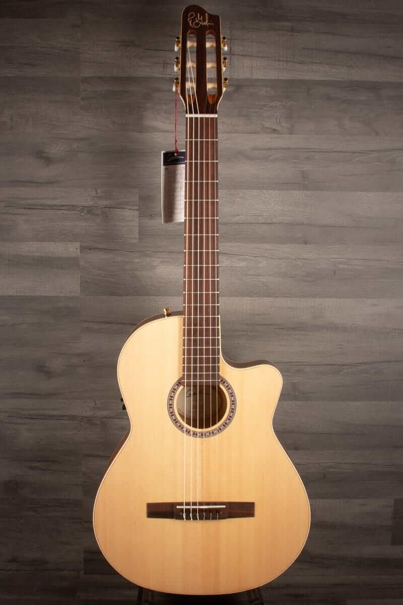 The range a thin-bodied guitar offers is immense. Play with deep bass and soaring trebles knowing that every sound is being captured and projected with power. Their beauty is propelled even further by the combination of Canadian wild cherry wood and solid spruce top. The two woods combine complexities of tone to create an amazing sound which offers clarity and sustain in equal measure.