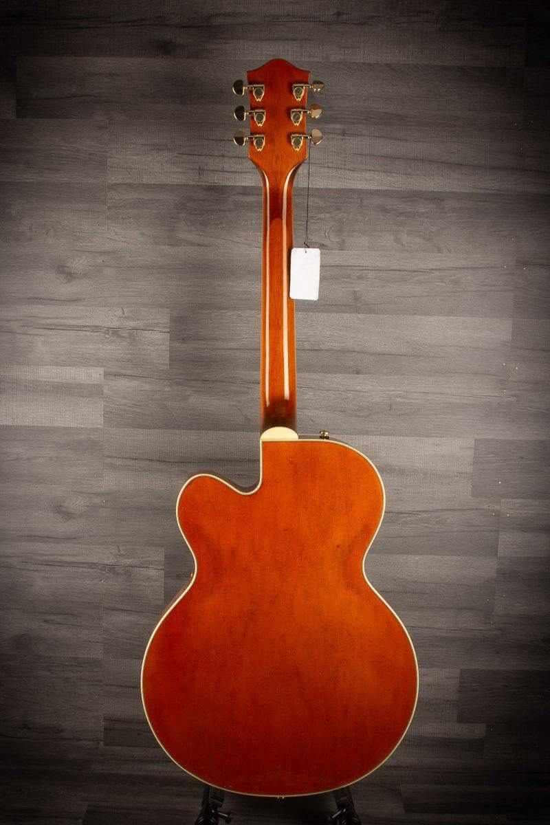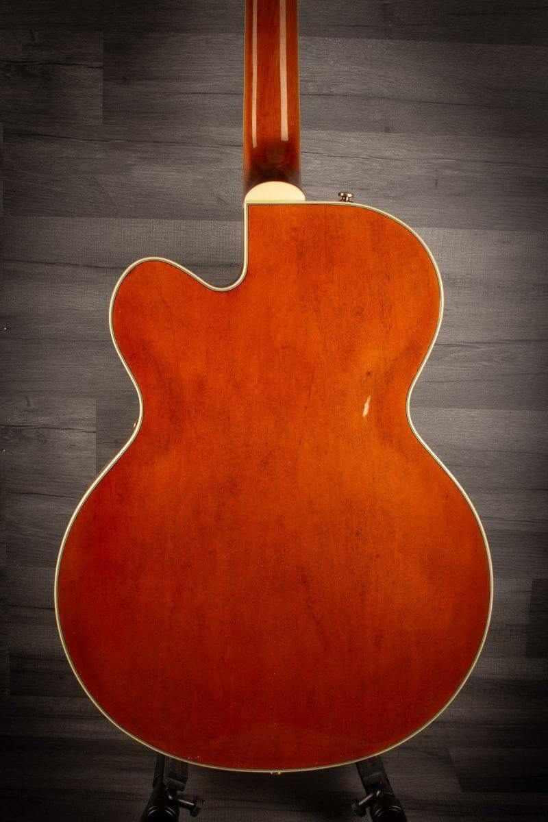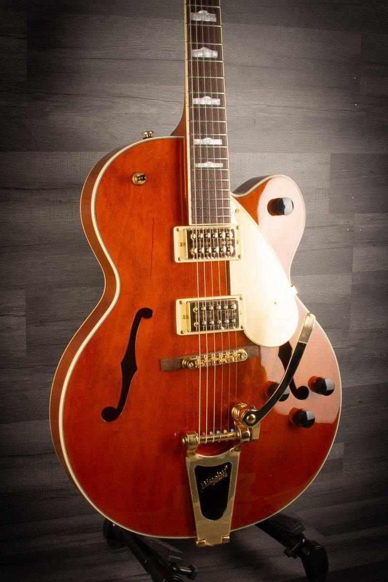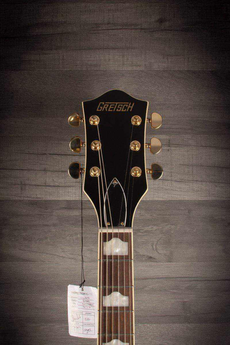 All the classic eye-catching style you’ve come to expect from Gretsch is here—vintage-style black control knobs, enlarged F-holes for increased acoustic projection, elegant aged white binding with upgraded purfling and gleaming gold hardware.
