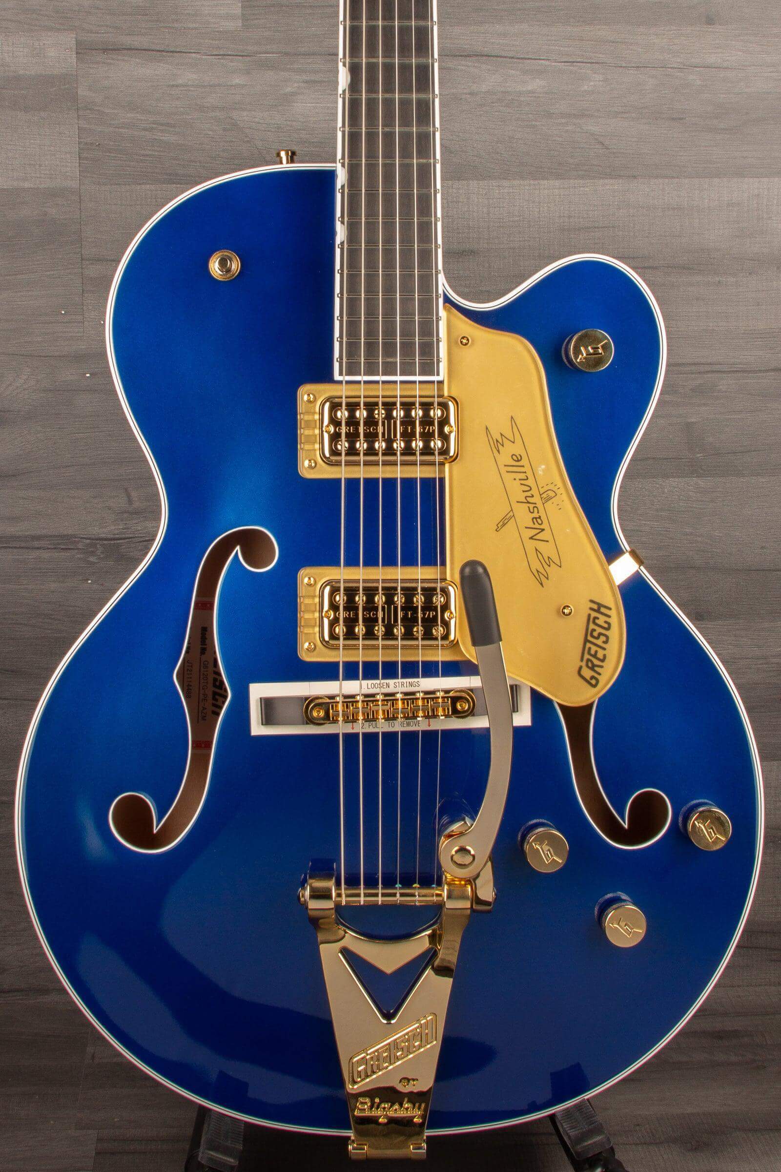 This Nashville is ready to bring Music City style to the stage — from the Azure Metallic or Orange Stain gloss urethane finish to the gold Gotoh® locking tuning machines and gold G-arrow control knobs to the white bound neck, body and F-holes, striking pearloid Neo-Classic™ thumbnail inlays and gold plexi pickguard with black Gretsch logo and Nashville post sign. Built to be a true workhorse every song, every night, the G6120TG Players Edition Nashville Hollow Body with String-Thru Bigsby and Gold Hardware updates the archetypical hollowbody electric guitar for modern players who demand distinction from themselves and their tools.