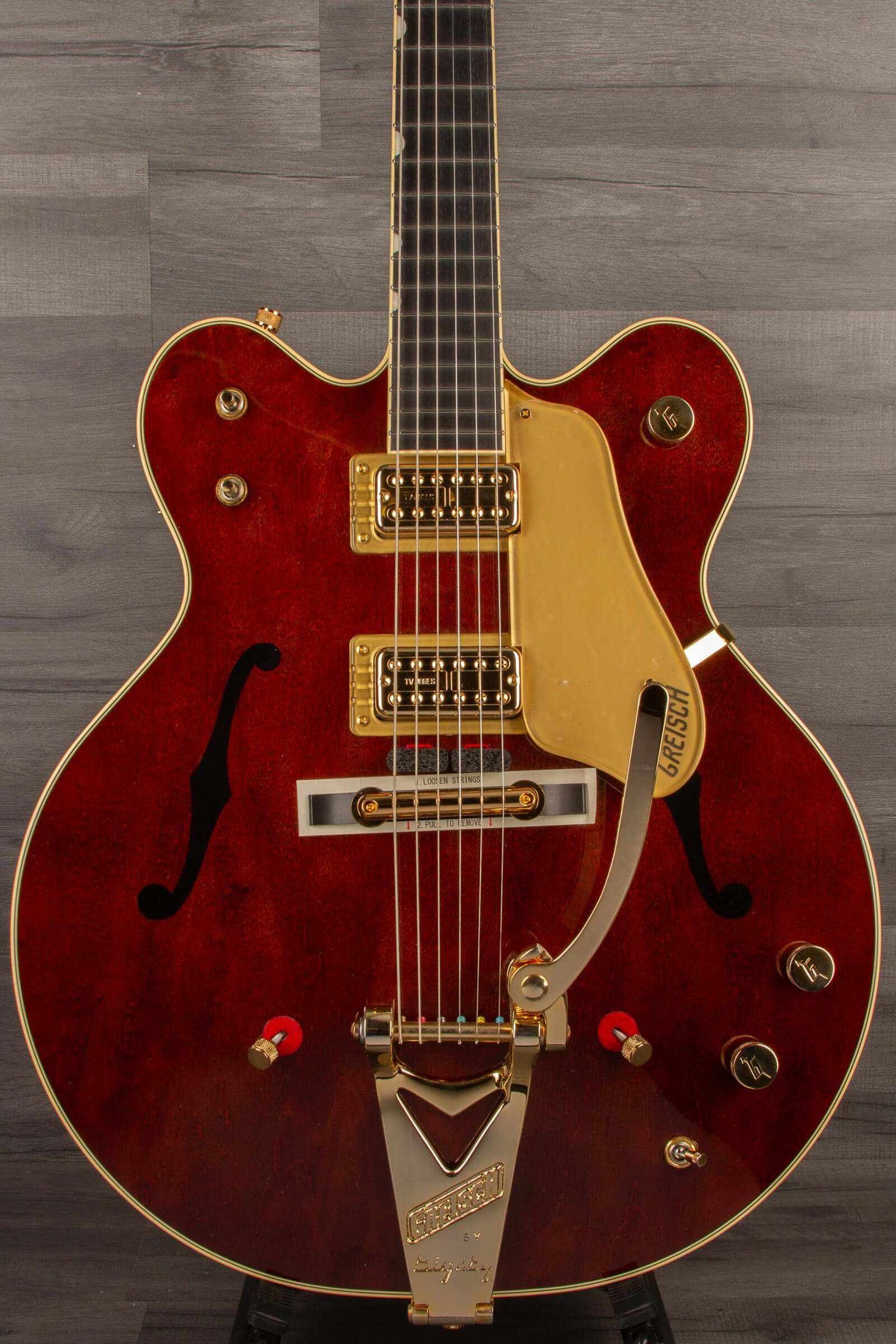 A true rock ‘n’ roll classic, this guitar features the appointments that made this guitar a legend dual foam string mutes with red felt surrounds, standby switch, laminated 3-ply maple top with simulated F Holes, gold “G Arrow” control knobs, aged white binding with black purfling, gloss urethane finish, aged pearloid thumbnail inlays, gold vintage thick plexi pickguard with Gretsch logo and gold Grover Imperial tuning machines. A distinguished instrument from the earliest days of the British Invasion, the G6122T-62 Vintage Select Edition '62 Chet Atkins Country Gentleman Hollow Body with Bigsby is the guitar that laid down the foundation of rock as we know it.