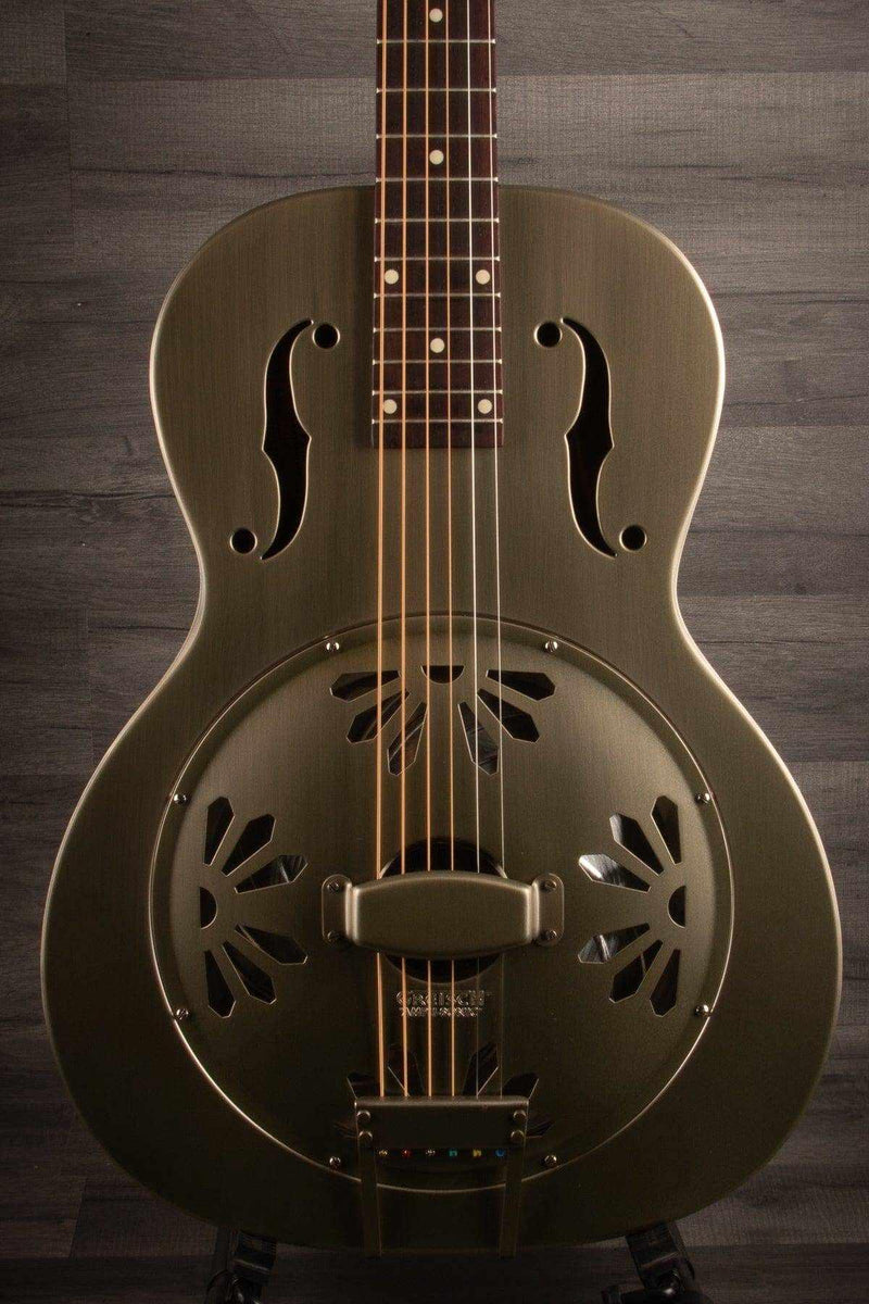 The Gretsch G9201 Honey Dipper Resonator features a nickel-plated brass body, a biscuit bridge, and a single cone resonator, providing a distinctive and powerful tone ideal for blues and slide guitar playing.
