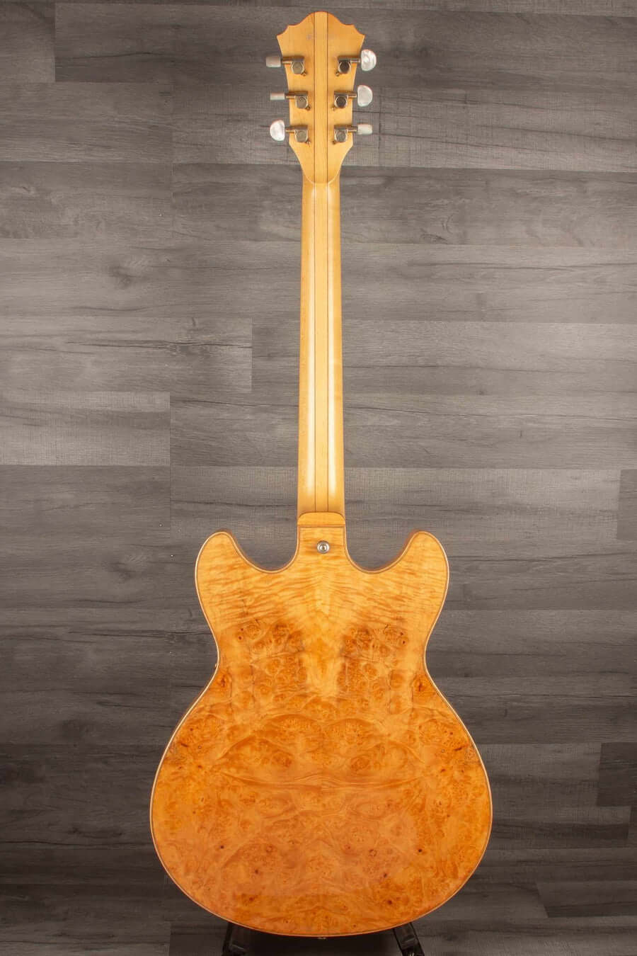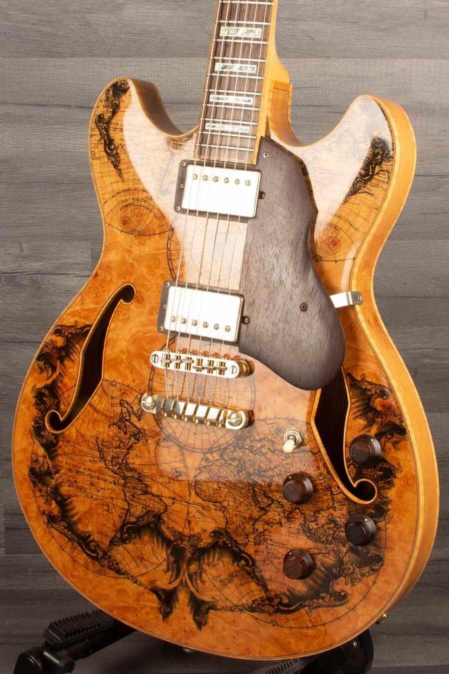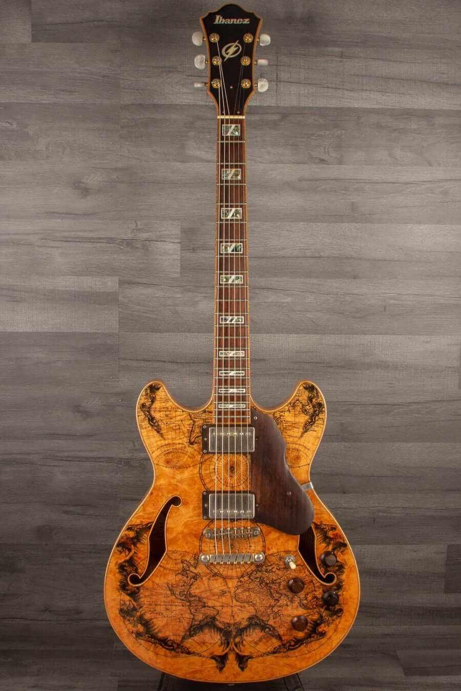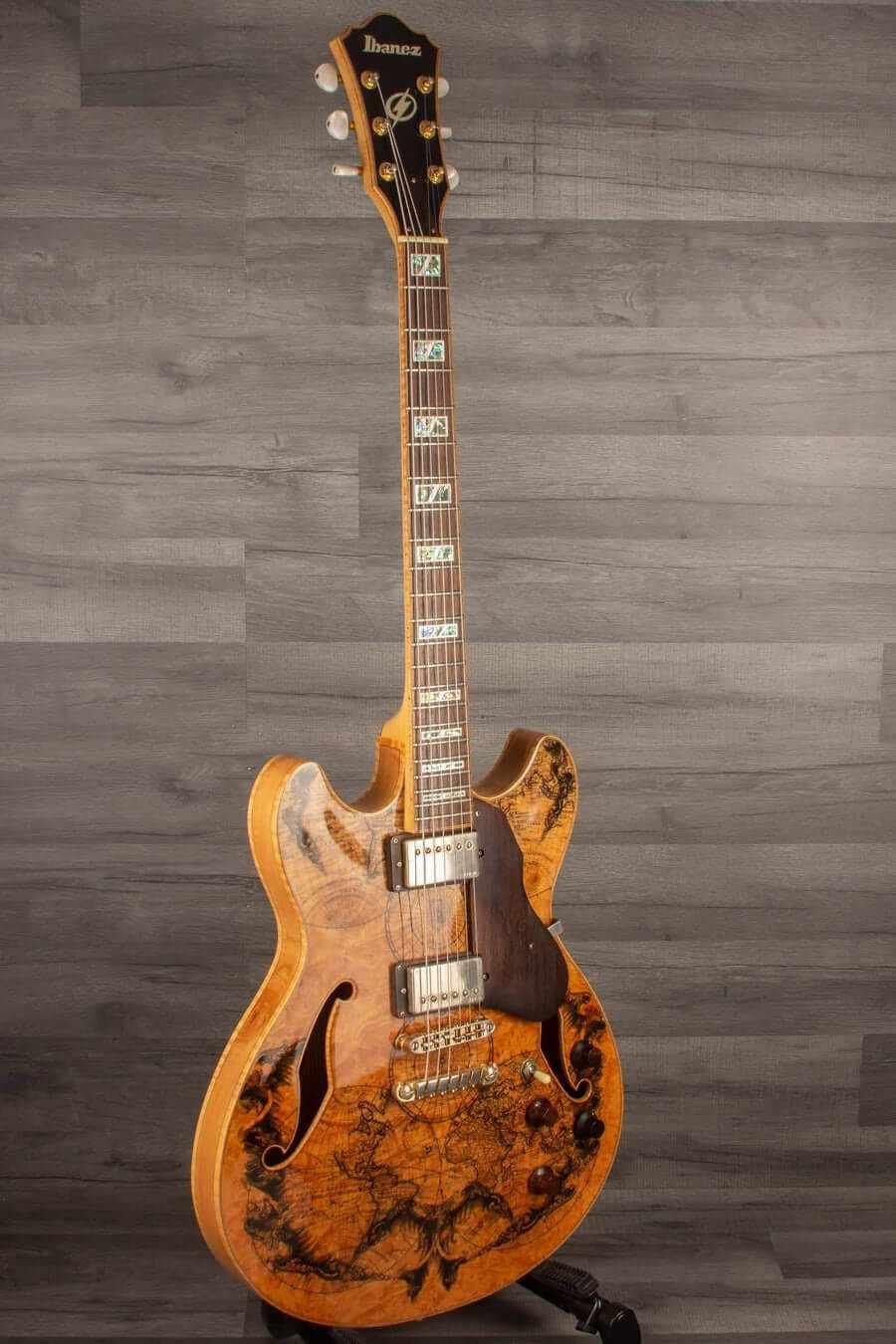 The IBANEZ Artcore Custom is the flagship of the Artcore series, featuring beautiful maple bodies and maple/walnut set-in neck construction, producing a warm yet punchy tone. Wood control knobs and matching pickguard enhance the exquisite apperance of the Artcore Custom. This one is a AS103BM. That's an amazingly wild guitar. The back and front are quite different... The back wood is absolutely stunning - the front wood is too. Take a glance at this guitar, it talks by itself.