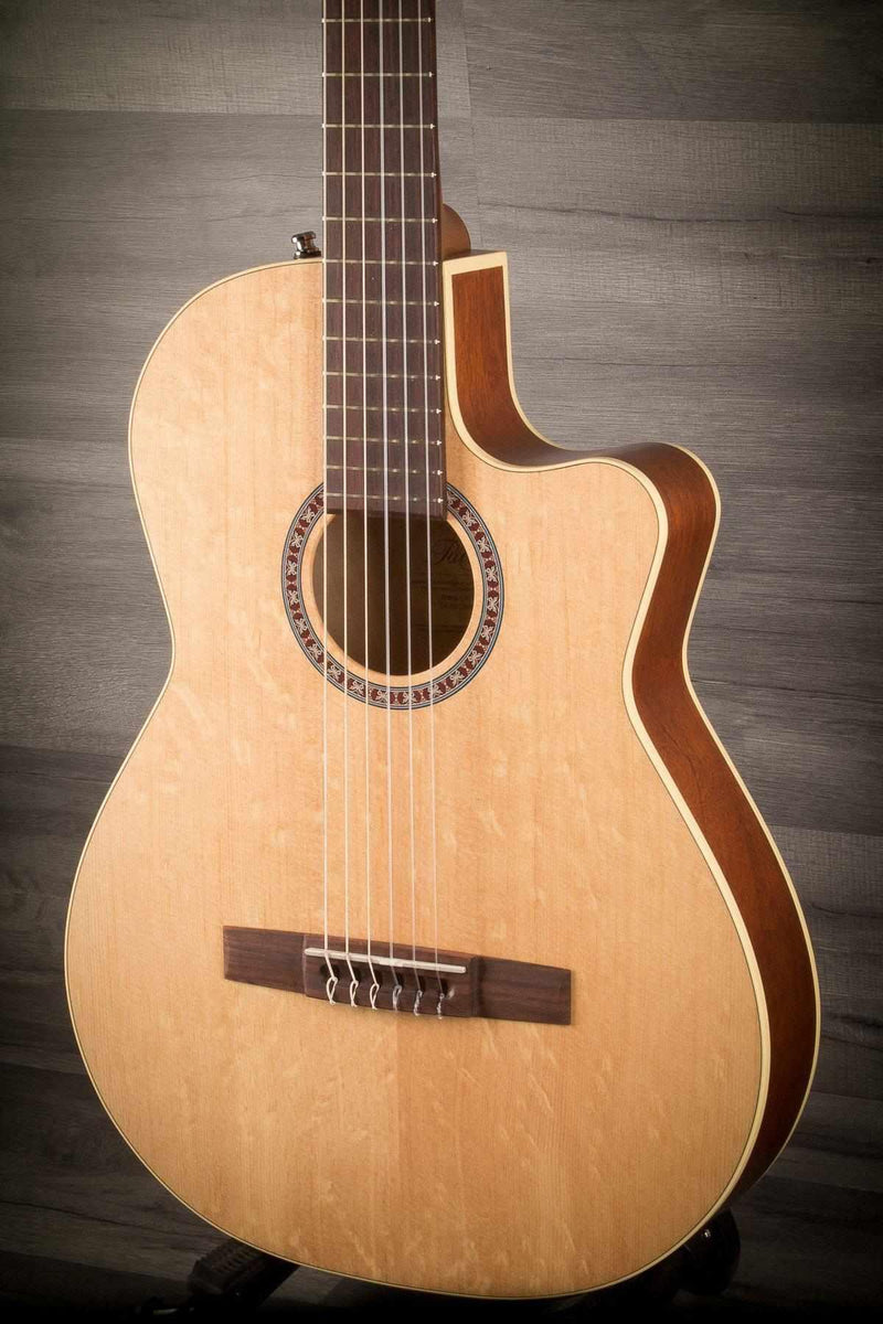 The La Patrie Arena CW QIT, Natural is a beautiful thinline classical guitar, crafted from a stunning spruce top and wild cherry body to deliver warm tones with a rich projection. Its top has been pressure tested to ensure it has the highest level of stiffness and rigidity, enhancing the Arena's maximum harmonic content and durability. A mahogany neck and rosewood fingerboard are also added, injecting the overall sound with incredible depth and dynamics. This La Patrie Guitar is also equipped with Godin's Q1T electronics, featuring a responsive saddle-transducer and preamp section to ensure players deliver a truly stunning performance in the studio and on stage. Handcrafted in Canada with great attention to detail, the La Patrie Arena CW QIT Guitar provides players with a whole new playing experience.
