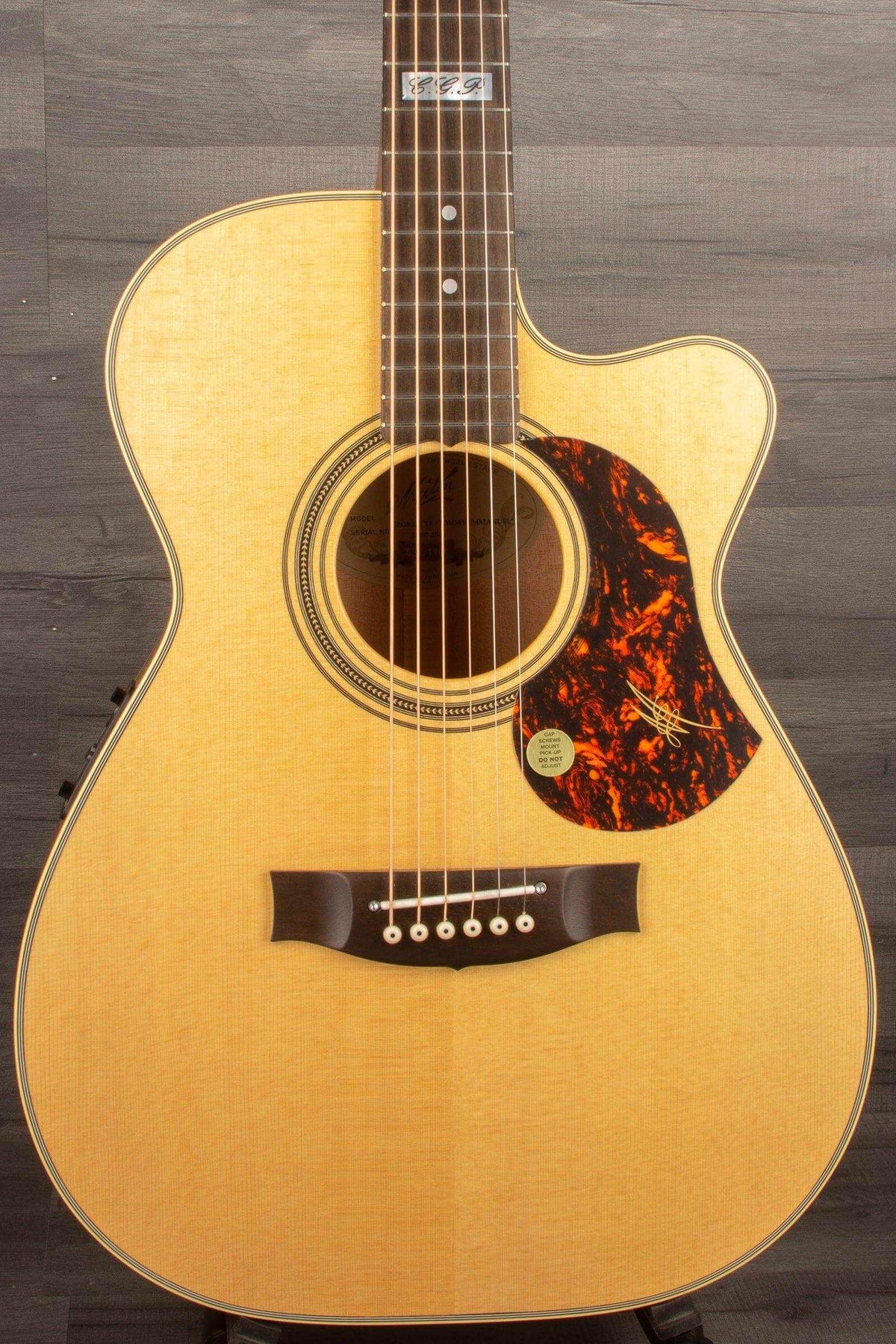 The Maton Tommy Emmanuel models feature a Mother of Pearl block inlay on the 12th Fret, engraved with "C.G.P." The acronym stands for "Certified Guitar Player," a title bestowed on Tommy by Chet Atkins and held by only 3 other guitarists in the world - John Knowles, Jerry Reed and Steve Warriner.