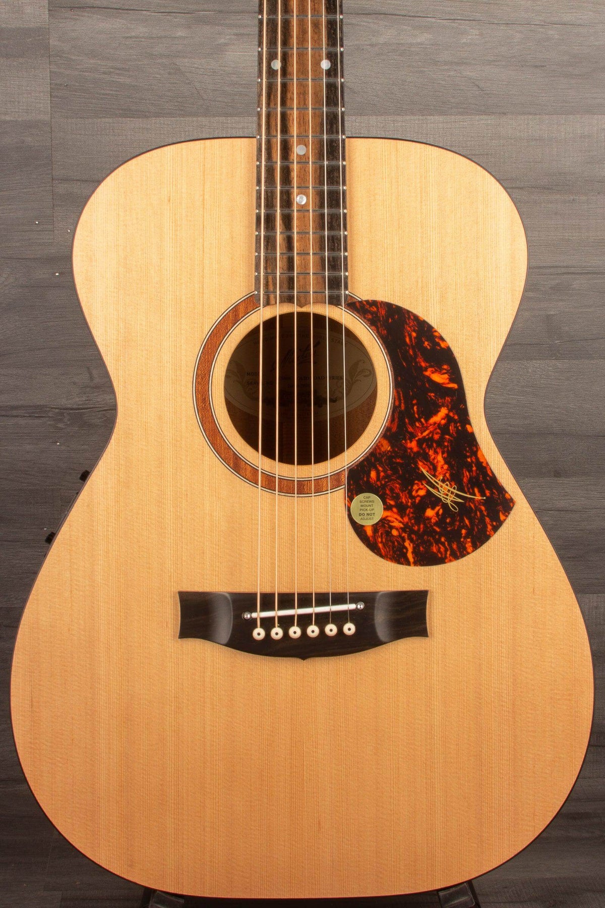 Solid Blackwood back and sides and a Western Red Cedar top. The Maton SRS 808 is a beautiful little guitar and combines the warm, full tones of Blackwood with the top end sparkle of Cedar.