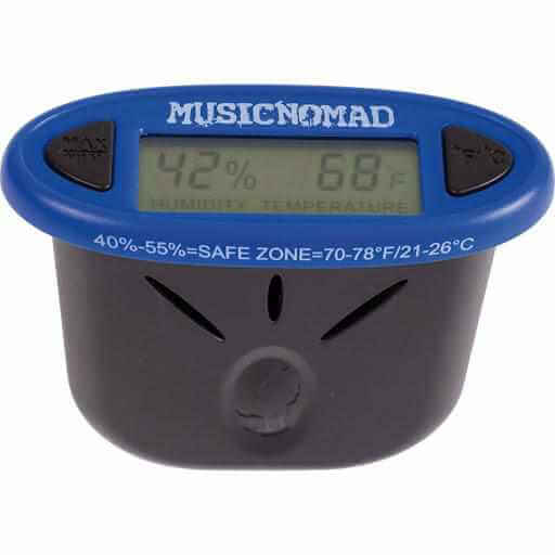 Music Nomad's HumiReader is a humidity and temperature monitor that is accurate, reliable, and easy to use. This innovative design lets you customize where you want to measure, allowing you to hang the monitor from your acoustic guitar strings and measure inside the sound hole. You can also measure inside the case near the headstock or fretboard/fingerboard with the Case Holster, which has a strong adhesive backing that sticks in your case and holds the HumiReader. Or just place it in any room you want to monitor. Our accurate sensor monitors your string instrument's environment every 20 seconds and gives you the humidity and temperature readings on an easy-to-read LCD display. It provides the maximum and minimum range over the period you are measuring and can be reset at any time. It also features a reminder on the humidity and temperature safe zone you want to keep your string instrument, a long-lasting AG 13 battery, and Fahrenheit or Celsius readings. Protecting your string instruments just got easier.