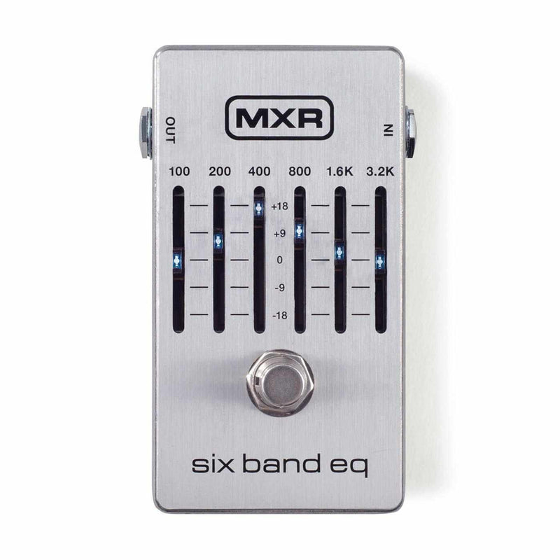 The MXR Six Band EQ has been upgraded with noise-reduction circuitry, true bypass switching, brighter LEDs for increased visibility, and a lightweight aluminum housing. It covers all the essential guitar frequencies, with each slider ready to deliver +/-18dB of cut or boost for incredible control over your sound. The Six Band EQ can create scooped-mid rhythm tones with massive low end, add natural sounding warmth to a quacky acoustic pickup, eliminate onstage feed-back, and much more. You can also use the Six Band EQ in the effects loop of your amp for a huge, sculptable lead boost.