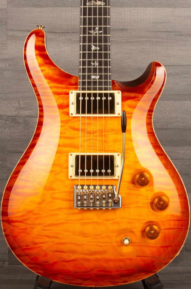The PRS Private Stock DGT McCarty Glow is a stunning blend of function and beauty. It boasts a 1-Piece Quilted Maple top with Citrus Glow microburst stain, African Ribbon Mahogany back, and Ebony fretboard with Abalone Birds inlays. It also features a DGT neck carve and Gen III tremolo bridge with locking saddles. Boasting Treble and Bass DGT TCI pickups with two volume and one push/pull tone control, this guitar offers endless sound possibilities. An African Mahogany backplate, bone nut, and Ebony truss rod cover with DGT inlay complete the look and feel.