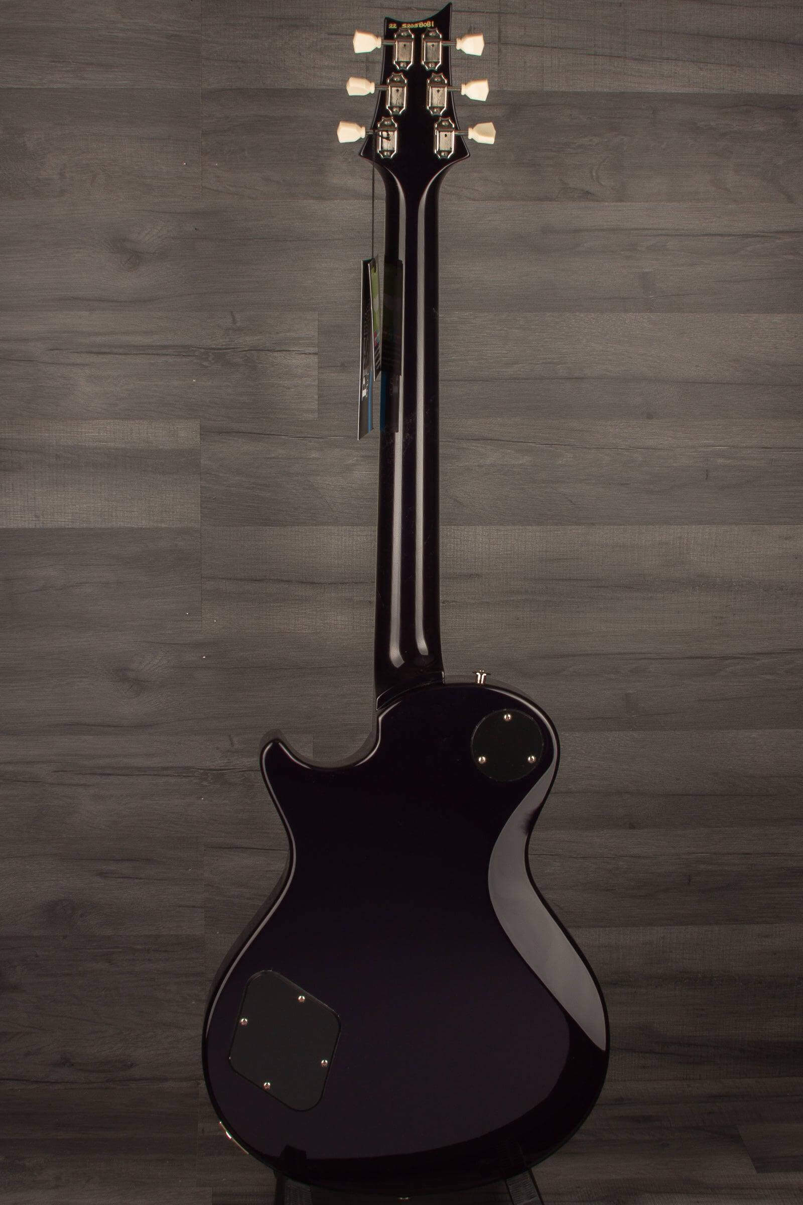 This guitar has a solid mahogany body with a maple top. That combo gives you deep, warm sound from the mahogany and bright, clear tones from the maple. The top is carved to be comfy against your body when you play.