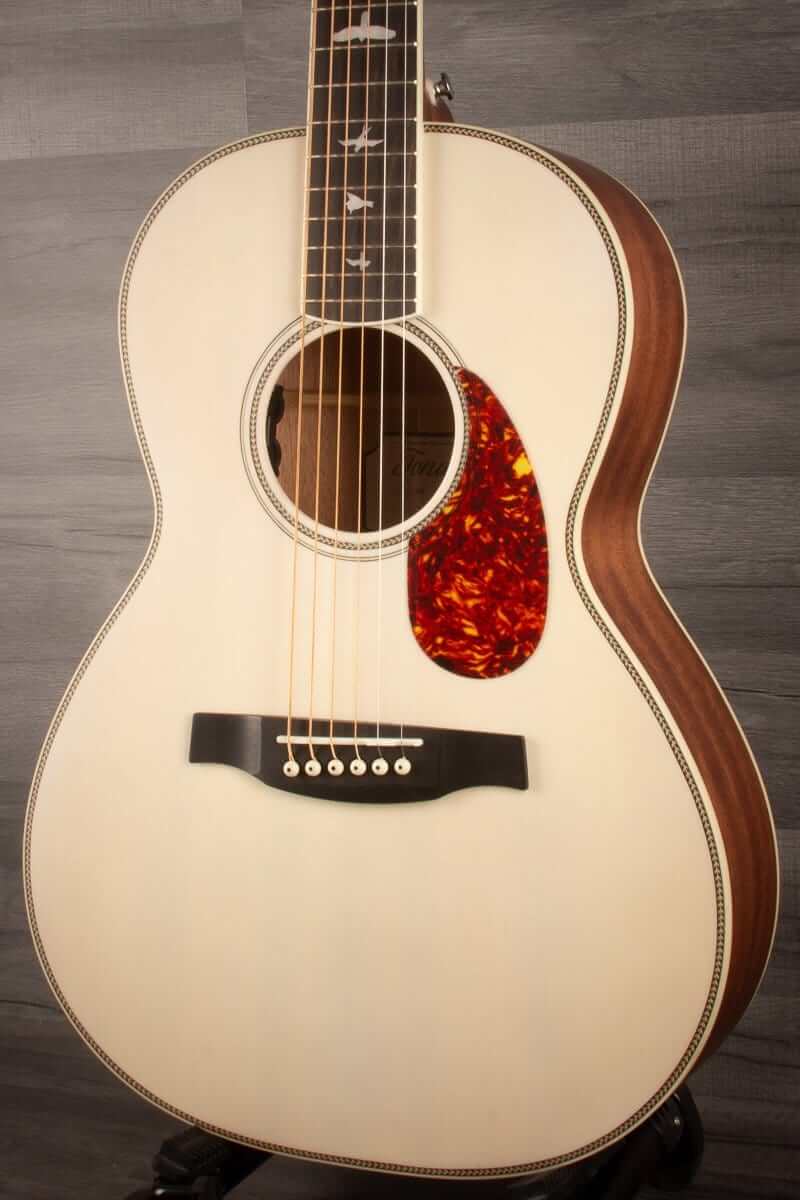 The PRS SE P20E is a parlor-sized acoustic with a big voice. The PRS P20E features all-mahogany construction, and has an organic, warm voice. Featuring PRS hybrid “X”/Classical bracing, which allows the top to freely vibrate, the SE P20E projects with even, bold tone. Its smaller size makes playing for hours fun and comfortable and allows for more convenient transport. Parlor-sized acoustics can be miscategorized because of their size but make no mistake this is a professional-grade instrument. Plug in, and the Fishman GT1 pickup system delivers dynamic, organic tone, so whether writing, recording, or performing the P20E is sure to impress. This electronics system features an undersaddle pickup and soundhole mounted preamp with easy-to-access volume and tone controls, which essentially transforms what some may consider a “couch guitar” into a workhorse stage instrument. Available in three satin finishes with herringbone rosettes and accents, PRS SE Parlor acoustics look as good as they sound. Other high-quality features include a solid mahogany top, ebony fretboard and bridge, bone nut and saddle, as well as PRS trademark bird inlays and headstock design. PRS SE Parlor acoustics come with a gig bag and are strung with 12-53 strings.