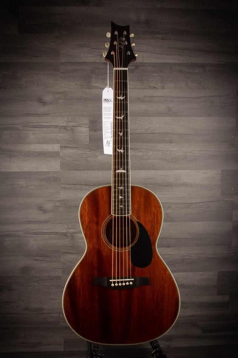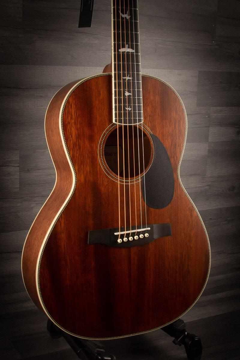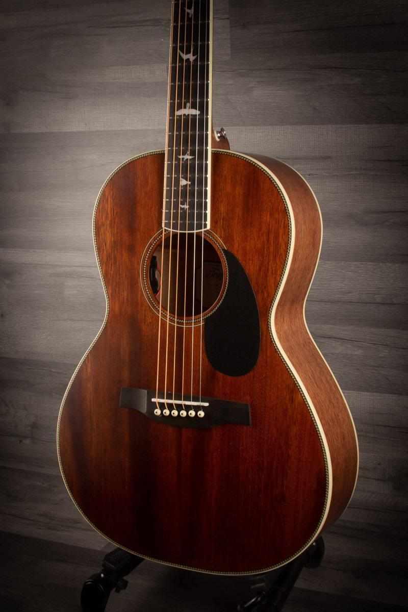 The PRS SE P20E is a parlor-sized acoustic with a big voice. The PRS P20E features all-mahogany construction, and has an organic, warm voice. Featuring PRS hybrid “X”/Classical bracing, which allows the top to freely vibrate, the SE P20E projects with even, bold tone. Its smaller size makes playing for hours fun and comfortable and allows for more convenient transport. Parlor-sized acoustics can be miscategorized because of their size but make no mistake this is a professional-grade instrument. Plug in, and the Fishman GT1 pickup system delivers dynamic, organic tone, so whether writing, recording, or performing the P20E is sure to impress. This electronics system features an undersaddle pickup and soundhole mounted preamp with easy-to-access volume and tone controls, which essentially transforms what some may consider a “couch guitar” into a workhorse stage instrument. Available in three satin finishes with herringbone rosettes and accents, PRS SE Parlor acoustics look as good as they sound. Other high-quality features include a solid mahogany top, ebony fretboard and bridge, bone nut and saddle, as well as PRS trademark bird inlays and headstock design. PRS SE Parlor acoustics come with a gig bag and are strung with 12-53 strings.
