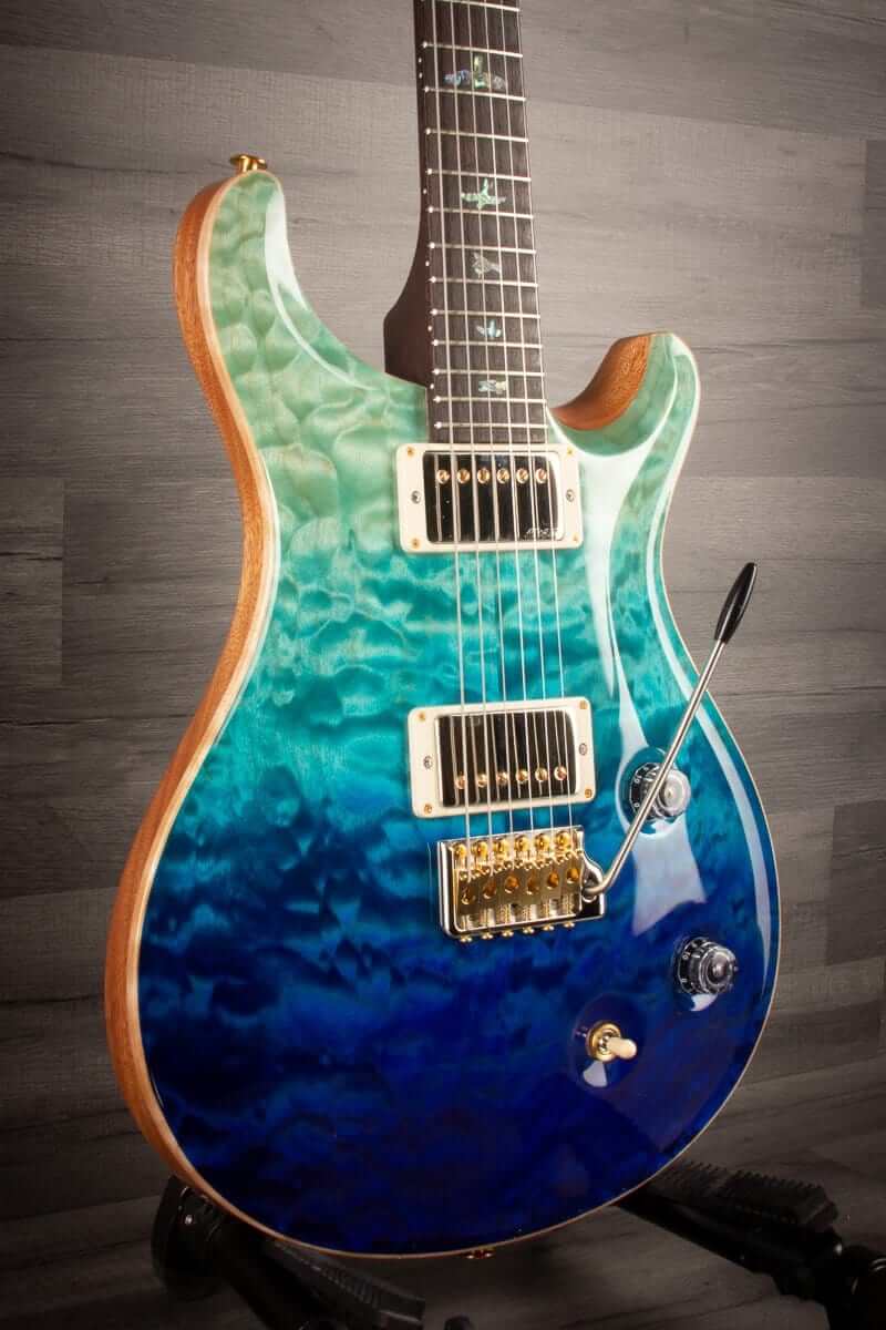 This PRS Wood Library Custom 22 Blue Fade Quilt top guitar is a professional-level instrument crafted with a stunning figured maple ten top, solid rosewood neck, and eye-catching blue fade color. It features 22 frets, birds inlays, and Hybrid hardware, as well as PRS 57/08 treble and bass pickups, 3-way push-pull tone, and a volume control for versatile playing.