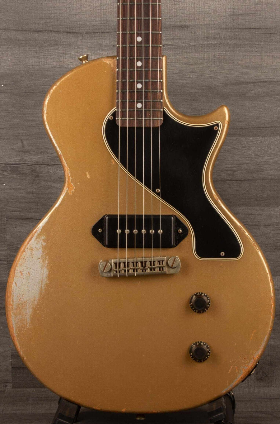 This Rock 'n Roll Relics Thunders SC Shoreline Gold guitar enhances your playing with its mahogany body and neck with 12” radius rosewood fingerboard. It's definitely a must-have for musicians, featuring custom RNRR Dog P90 pickups, a Kluson bridge and tuners on a plate, Graph Tech nut, and black silver bell cap knobs. Get the classic sound with no compromise on quality; with a light/medium aging and a TKL custom case, this guitar is ready to rock.
