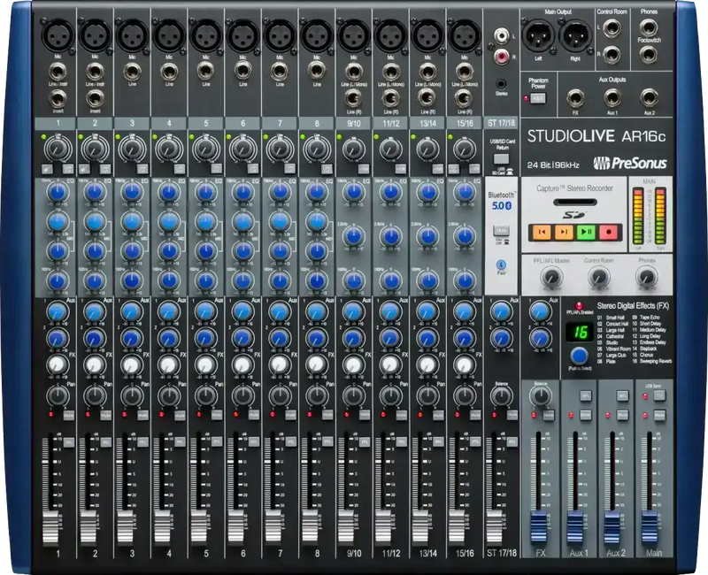 Don’t let the classic analog mixer design fool you—the StudioLive® AR16c was built to record. Featuring a pristine analog front end with 12 high-gain XMAX mic preamps and an 18x4, 24-bit, 96 kHz, USB-C™-compatible USB 2.0 audio interface, the StudioLive AR16c’s hybrid design makes it simple to mix and record. Add in a musical 3-band analog EQ, mic/line boost for low-level sources including vintage synths, all-new digital effects with rich reverbs and lush delays, Bluetooth® connectivity, and a stereo SD recorder... and you have a mixing and recording powerhouse that fulfills the needs of both modern musicians and content creators.