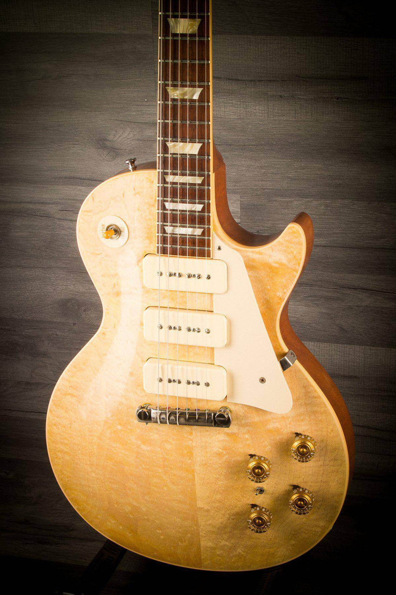 This is a second hand 2007 Gibson R4 1954 Reissue in good condition. It was originally a gold top with two P90 pickups. The top has been stripped of the gold finish (not via sanding) to reveal the maple top underneath.
