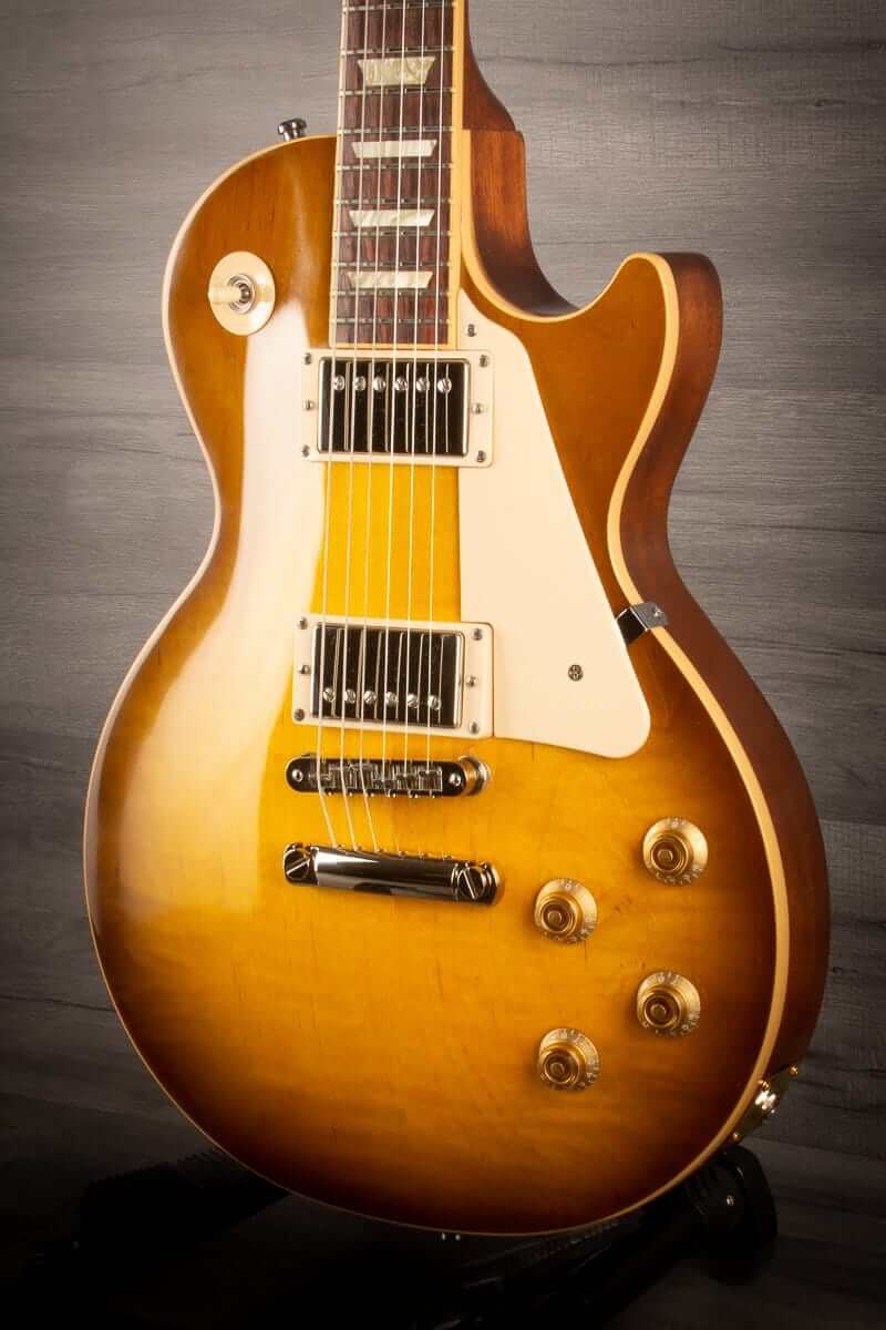 - Cream binding, pickguard, and pickup rings and amber top-hat knobs