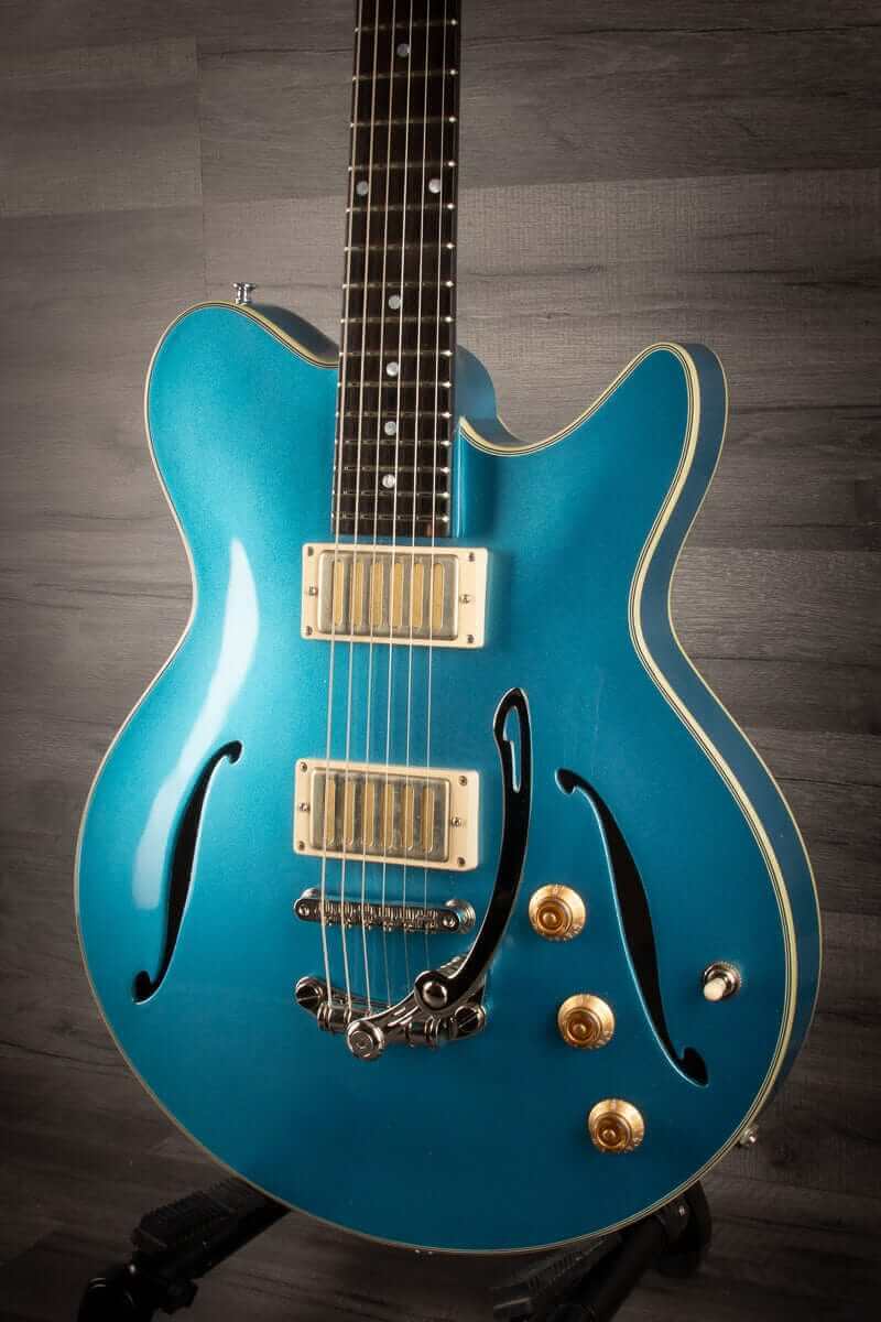 This 4.75" x 1.75" laminate Mahogany back and sides with Spruce top hand made guitar comes with TLT2N Tremolo and 3 point vario bridge and locking tuners. The Eastman Romeo LA Celestine Blue also 24.75" scale length and its equipped with a set of Seymour Duncan Radiator Phat Cat P-90 pickups with Ebony 12" radius fingerboard. This guitar is part of a spectacularly successful Hand Built range of acoustic and electric guitars taking the world by storm. This guitar also demonstrates some wonderful attention to detail with its stylish pearl headstock inlay and half circle side dots, among many other tasty finishing touches.