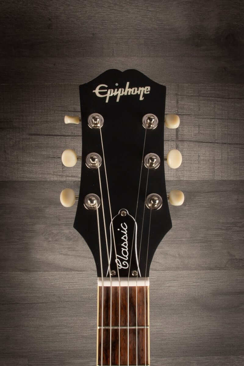 The Epiphone SG Classic Worn P90s guitar is crafted of mahogany with a slim-taper neck profile and 12" fingerboard radius. It features Locktone ABR Tune-o-matic bridge, 2 P-90 Pro pickups, and 2-volume, 2-tone controls with a 3-way Epiphone toggle. Its worn nickel finish and Inverness Green colour will make a statement on any stage.