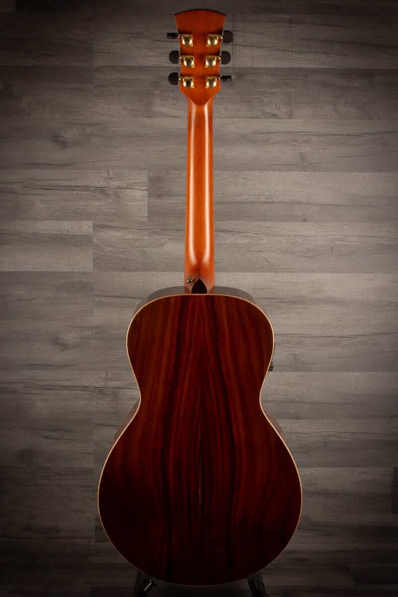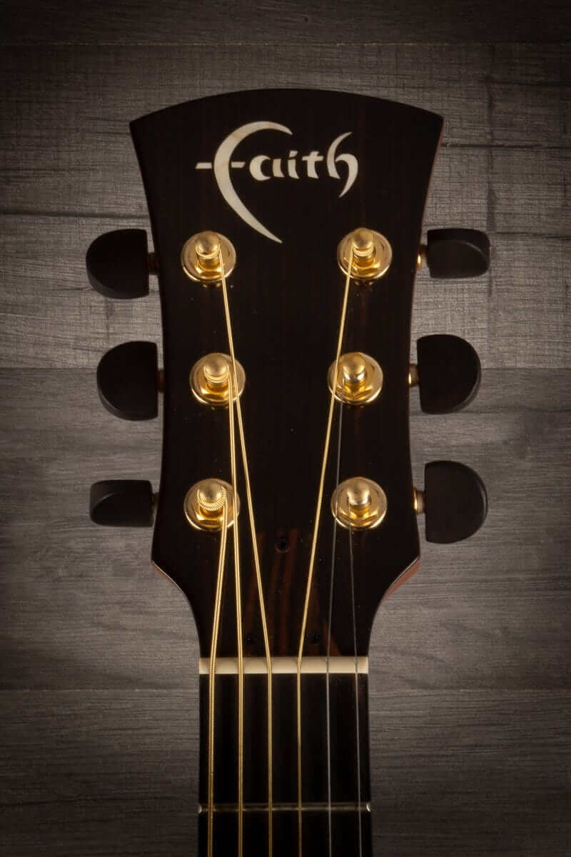 Faith HiGloss series are designed to offer both visual and aural beauty. Using high grade Englemann Spruce for the top and highly-figured Rosewood for the back and sides, HiGloss models feature solid Flamed Maple binding and Macassan Ebony for the fingerboard, bridge, headplate and heelcap.