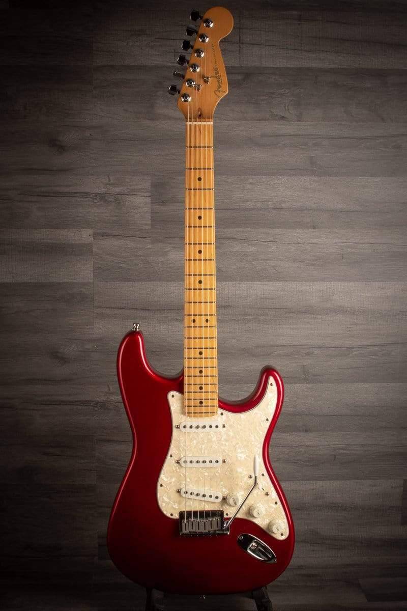 Fender USA unveiled their upgraded American Standard Stratocaster series in 1997, the "Lone Star," "Big Apple" and "Roadhouse," with this Roadhouse model flaunting three overwound Texas Special single-coil pickups in the standard Stratocaster configuration, plus a pearl guard, a maple neck with double string trees, and a radiant Candy Apple Red finish.