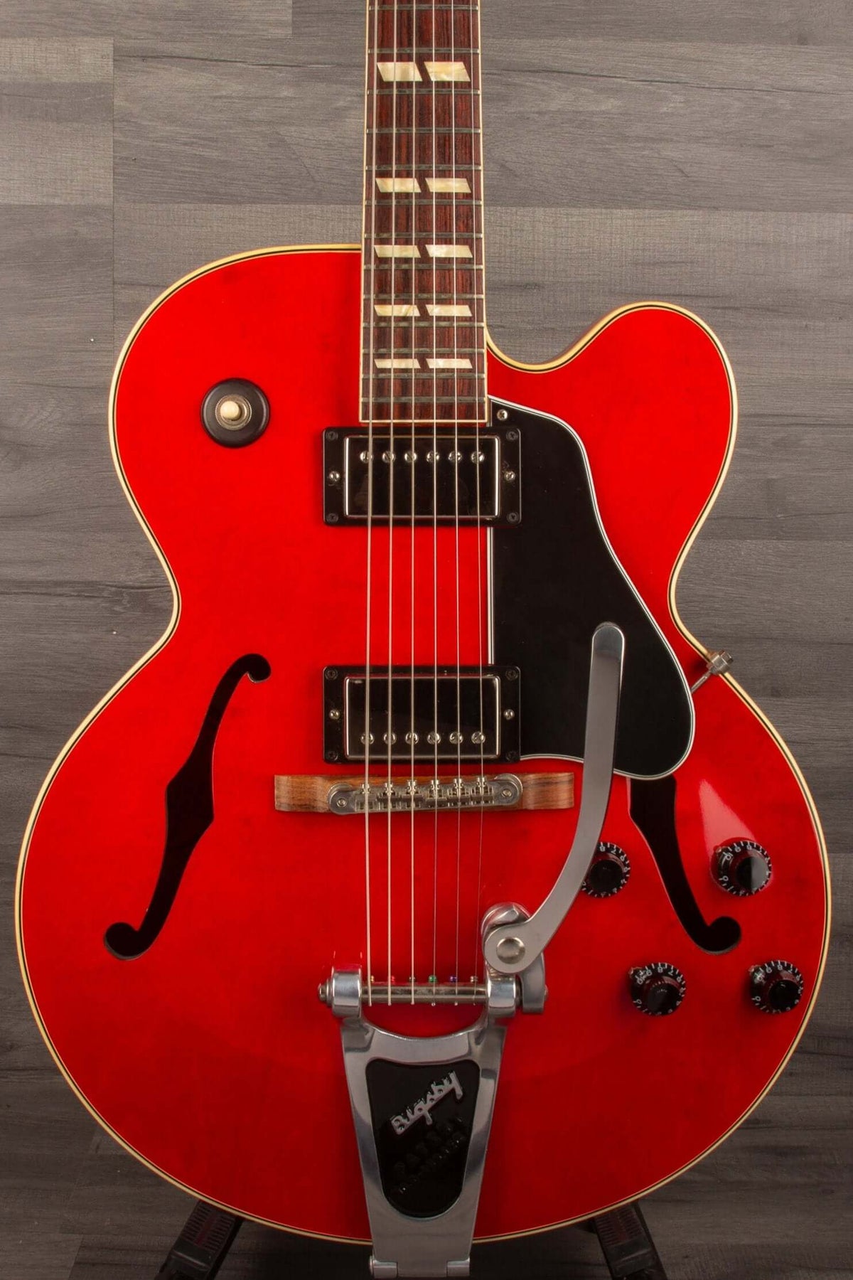 The Gibson ES-275 2016 Bigsby Cherry embraces decades of Gibson's expertise in crafting hollowbody archtop electric guitars, offering a highly refined new model. With its rounded L-5-inspired cutaway and medium-depth body, this guitar boasts exceptional features such as a tubeless Historic truss rod, rolled fingerboard binding, ABR-1 bridge with titanium saddles, a genuine bone nut, trapeze tailpiece, and PAF-inspired MHS humbuckers. This fully hollow archtop is based on the L-5 shape, but with a more compact 2-inch depth for a truly acoustic sound. Along with elegant pearl split-parallelogram inlays, the guitar features a genuine bone nut for enhanced acoustic resonance and sustain. The fingerboard binding is specially rolled to create a smoother playing experience, while the historic truss rod (without a tube) is known for improving resonance and sustain. The MHS humbuckers are top-of-the-line