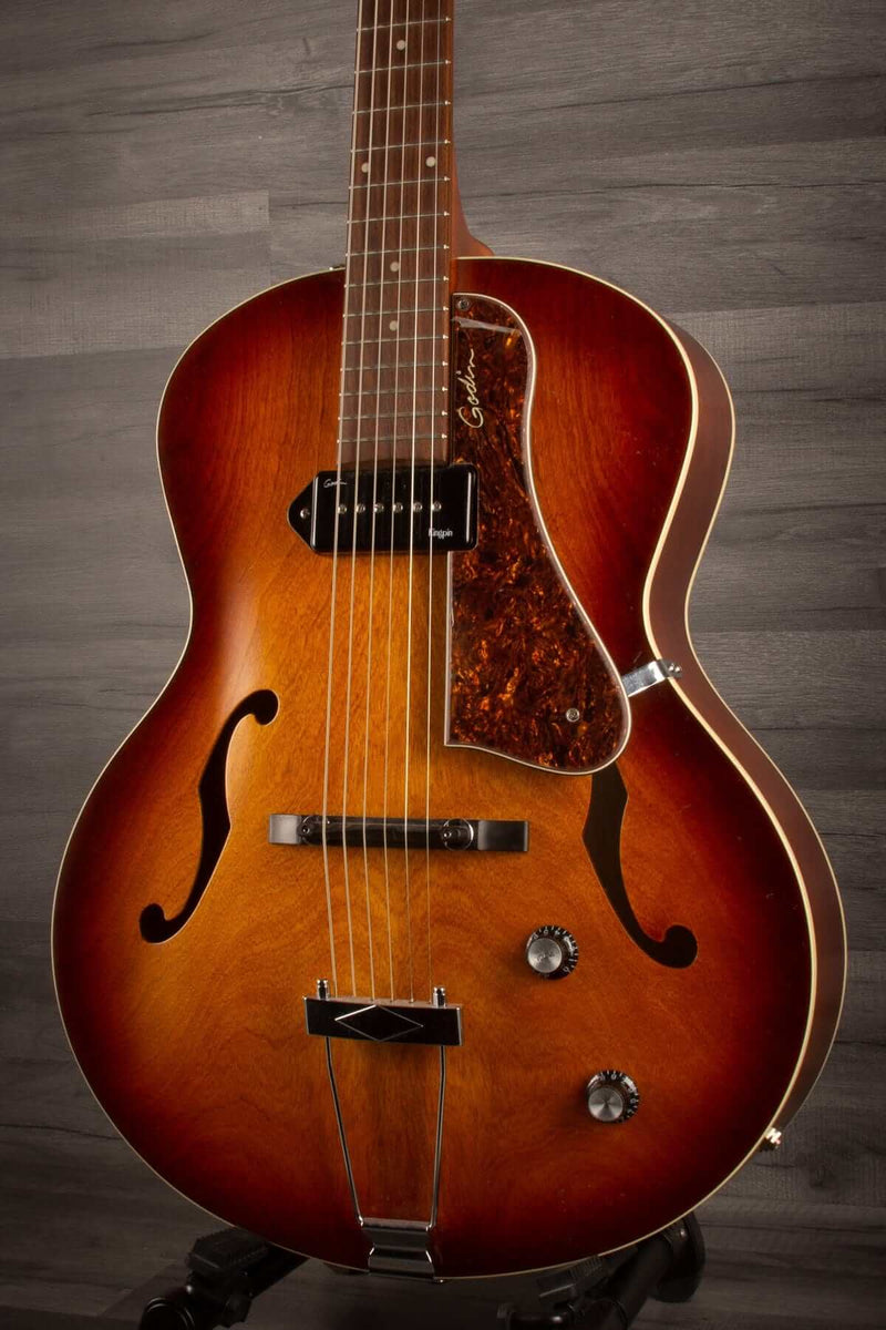 This wonderful Godin kingpin P90 guitar boasts a tactile and extremely attractive custom polish Cognac Burst finish. Its a terrific vintage inspired design that ensures this guitar is just as delightful to look, at as it is to play and enjoy listening too. Other impressive features include a wonderful P90 pickup, some tasteful cream binding, and a long list of carefully designed traditional touches that will appeal to virtually any style of player. This Canadian built Godin Kingpin would be perfect for any guitarist on the look out for something a little more individual and stylish from an arch top design without breaking the bank. With more projection & volume in the low/mids than traditional archtop acoustic guitars, the dynamically rich tone of the 5th Avenue makes this sophisticated instrument a dream to play. From Alt-Country, Delta Blues, Slide, Jazz to Rock, the 5th Avenue can really deliver both acoustically and electrically. This latest version Godin Kingpin P90 single-coil pickup delivers all that classic, vintage tone with presence, clarity and a little attitude thrown in for good measure!