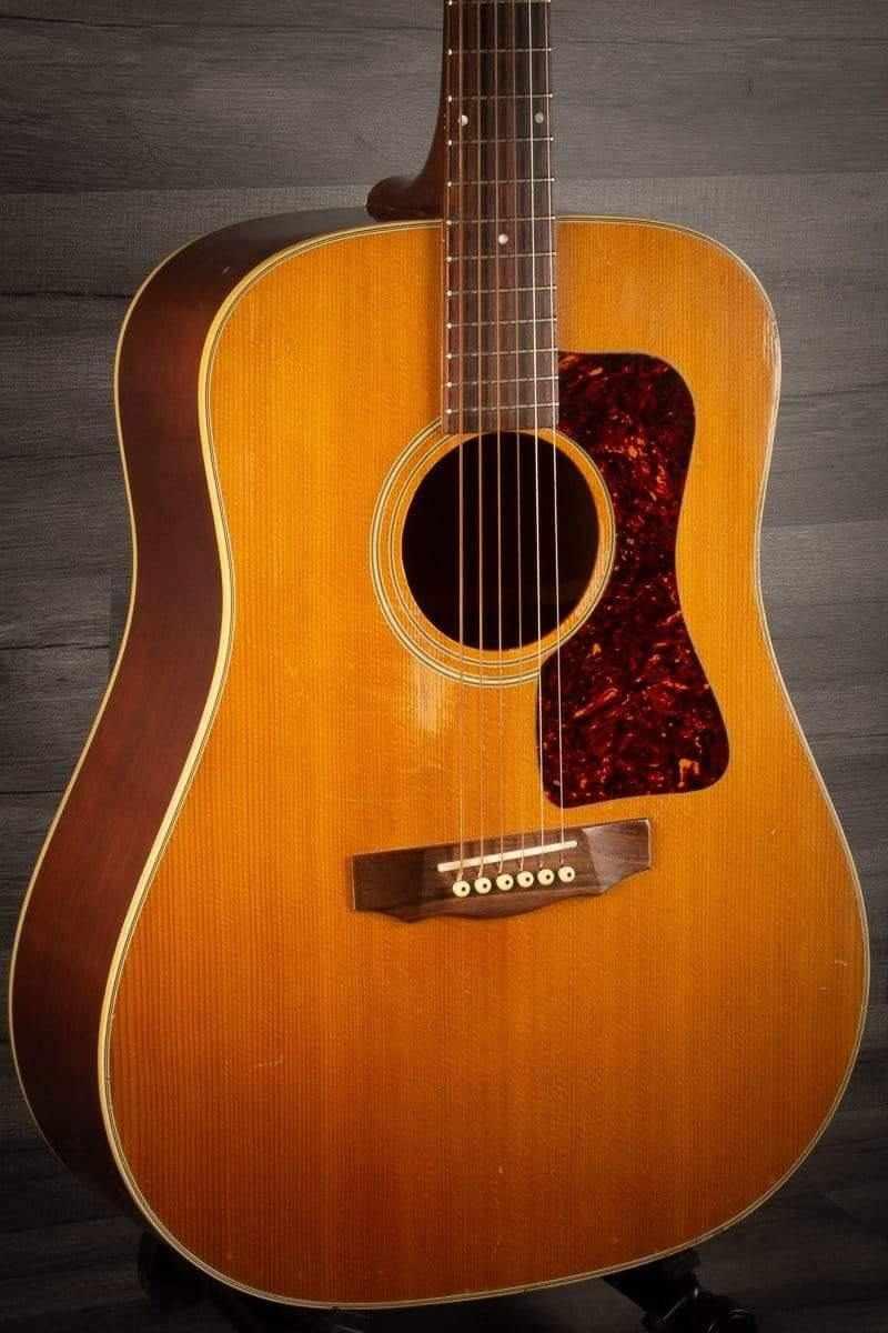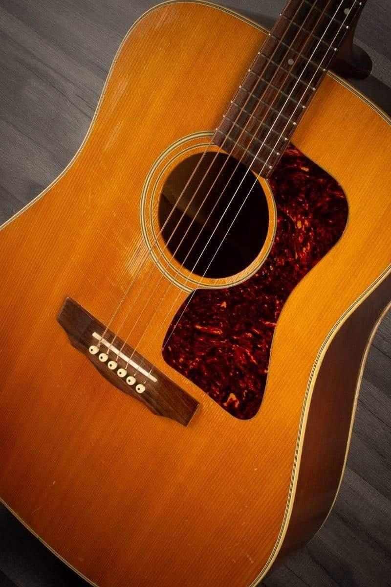 Amazing vintage Guild D6E-NT acoustic guitar made in Westerly, RI, USA. Gorgeous natural relic on this guitar! Gold hardware and beautiful ivory inlay in the headstock make this a real looker. Plays great with medium/low action, very comfortable to play. Natural relic includes awesome crazing on the top as well as little nicks and dings scattered around. A great sounding acoustic guitar with plenty of warmth and character. Rosewood fingerboard, Grover tuning machines.