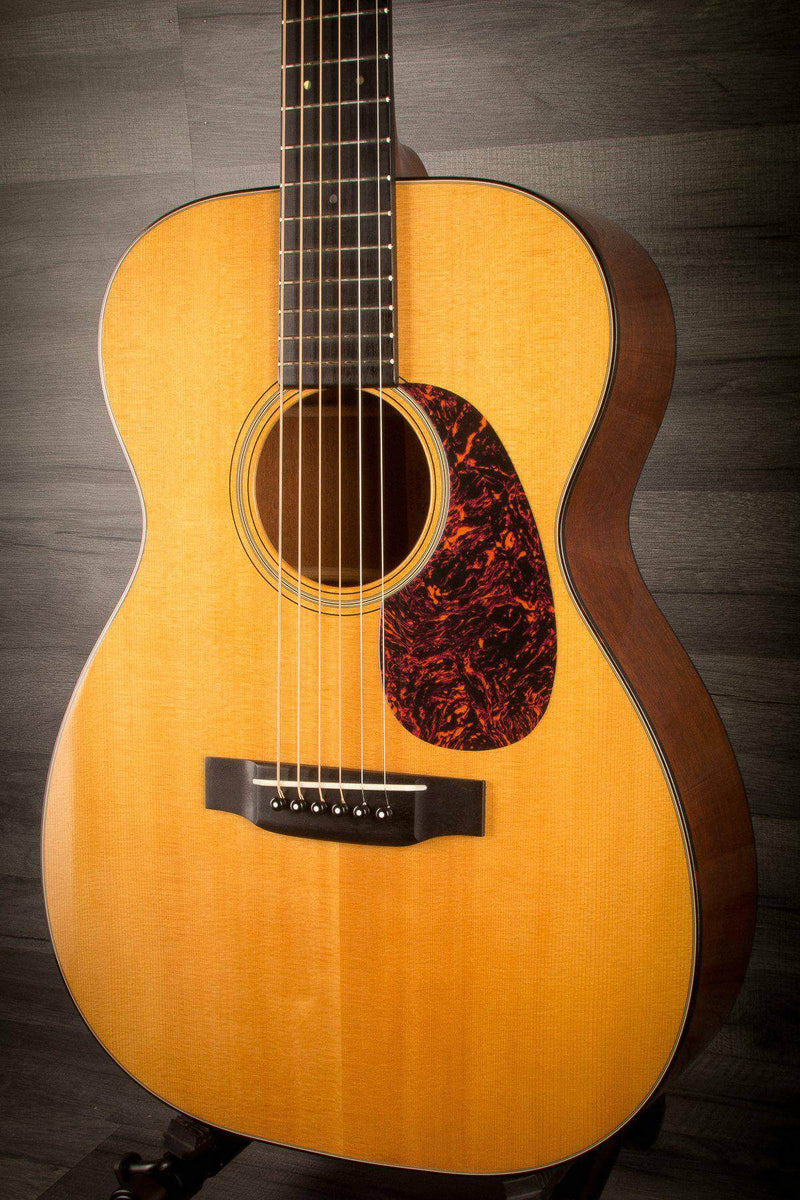 Double bound 00 body, spruce top, scalloped bracing, mahogany back, sides and 14-fret neck (modified V-shape), ebony fretboard, dot inlays, 20 frets, ebony bridge with long saddle, tortoise plastic pickguard and body binding, rosewood headstock overlay, Martin vintage style open geared tuners with butterbean buttons, 1-3/4" nut, 24.9" scale.