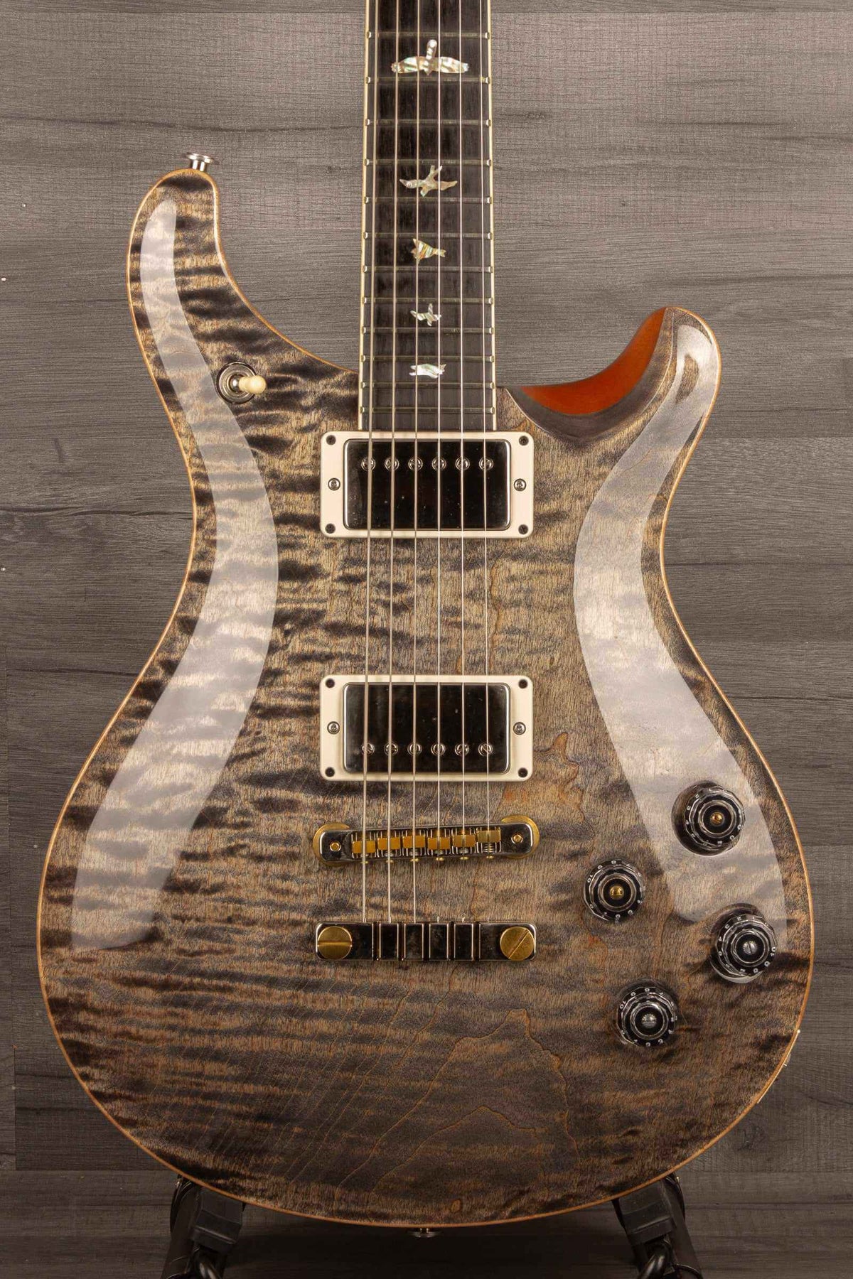 The PRS 594 McCarty Charcoal is a beautiful guitar, perfect for anyone looking for a combination of vintage style and modern sound. It has a carved figured maple top and mahogany body, a ebony fretboard with beautiful bird inlays, and vintage-style nickel tuning pegs. What's more, its classic 58/15 LT pickups make sure you always sound great. All of these features come together to make an instrument that's perfect for any music lover.