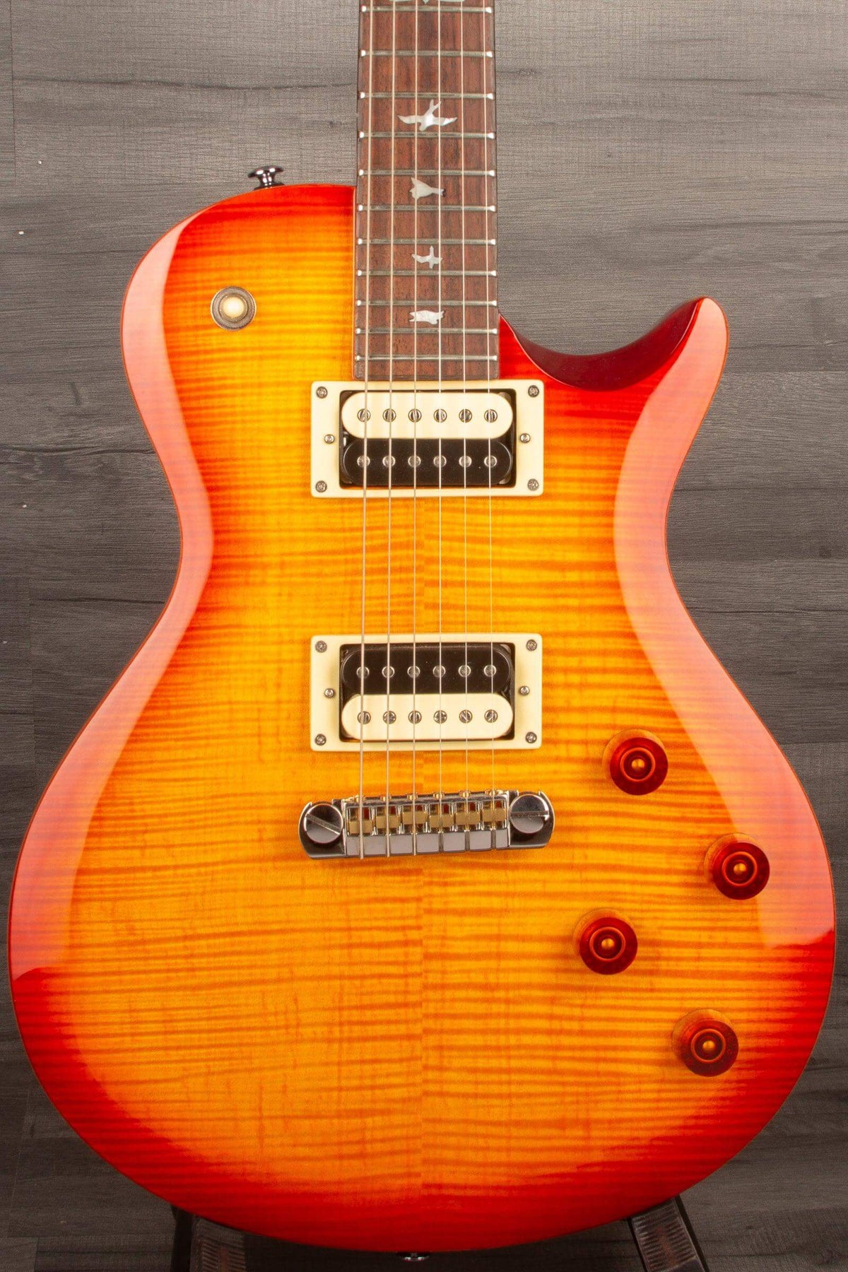 PRS' SE 245 boasts a Mahogany body, delivering a warm sound with plenty of harmonic richness in the mid-range. With bevels around the entirety of its singlecut shape, the SE 245 also has a cozy feel that allows you to play without hindrance.