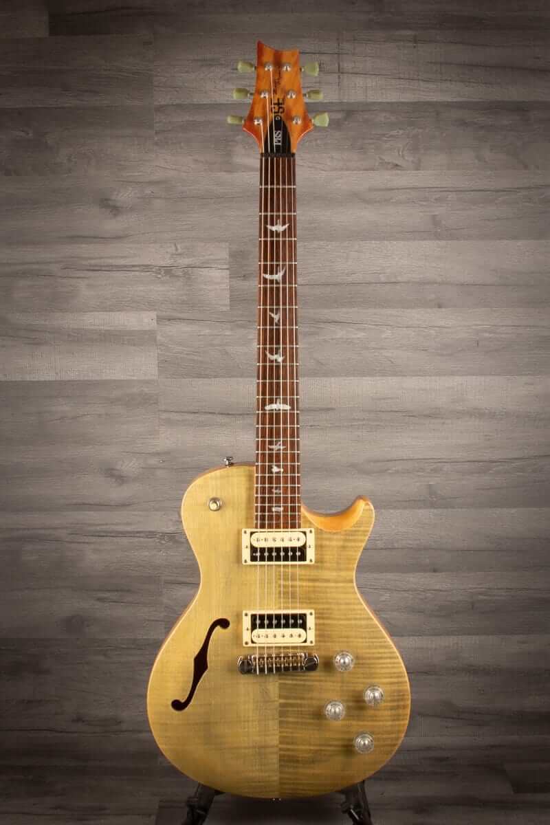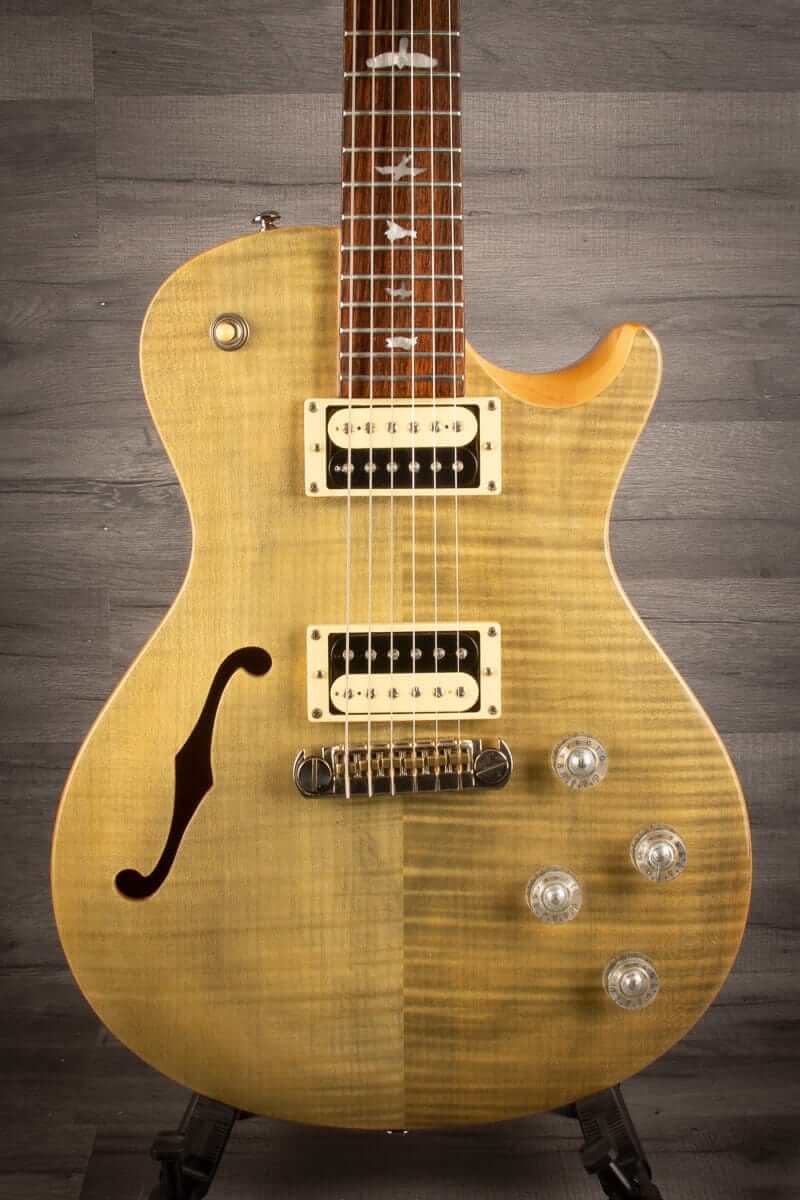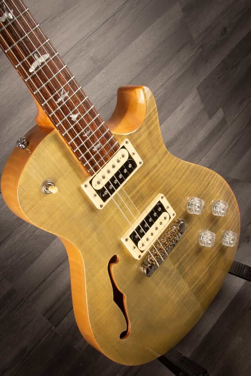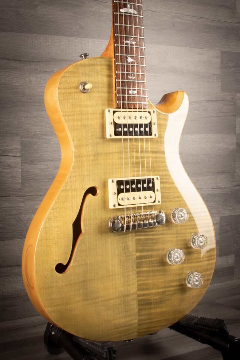 The 2014 SE Zach Myers features a chambered mahogany body with maple cap, flame maple veneer and single f-hole that provides smooth mid-range tones with a natural, resonant internal reverb. The 22-fret 24.5” scale length wide fat neck boasts a satin finish that gives the guitar a very comfortable, woody, worn-in feel. Additional appointments to the SE Zach Myers signature model include PRS adjustable stoptail bridge, vintage style tuners, and PRS SE 245 pickups paired with two volume and two tone controls and a 3-way toggle pickup switch.