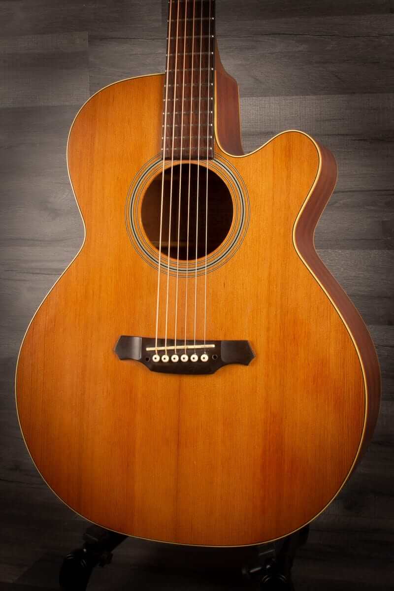 This original Takamine body is a scaled-down Jumbo at heart. The NEX has a silky balance to the tone that supports vocals beautifully.