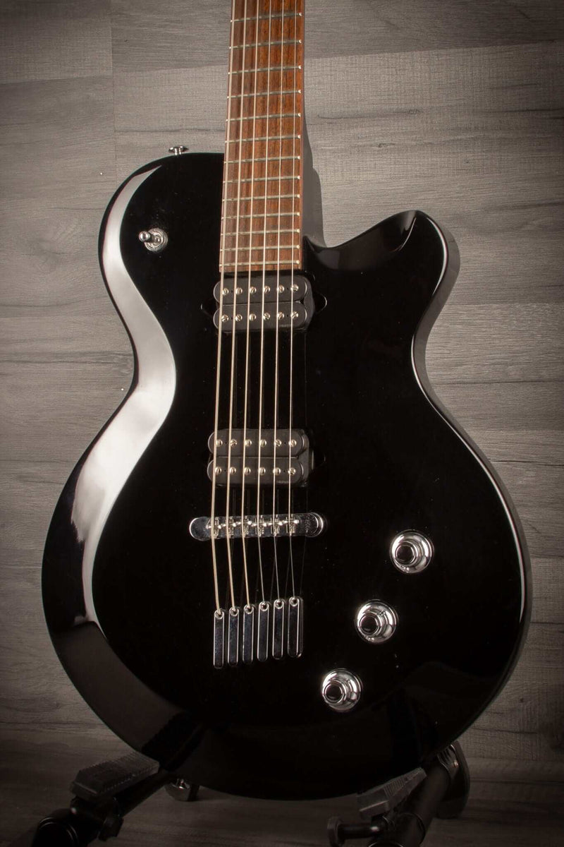 This is a used Yamaha Drop 6 model guitar, a baritone style electric finished in black with an extended 26.25" scale length that lets you hold intonation and string tension while tuning down to B standard or beyond. The guitar has two humbuckers with individual volume controls and a master 3-way tone switch for quick switching between either a full humbucker tone or something more like a single-coil.