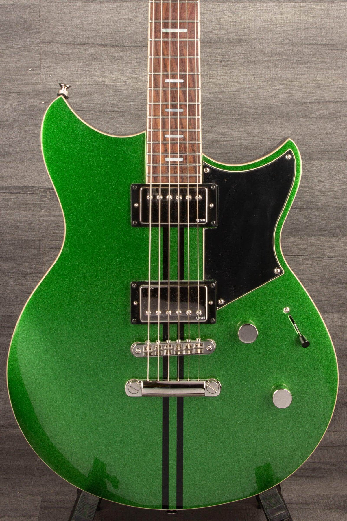 Make a statement with the Yamaha RSS20 Revstar in "Flash Green"! The lightweight chambered mahogany body and maple top provide clear, full sound, while the 3-piece mahogany neck with carbon reinforcement ensures stability. The rosewood fingerboard, 12" radius, and stainless steel jumbo frets guarantee a smooth playing experience. Tear it up with the VH5 alnico V humbuckers and customize your sound with a 5-way switch featuring subtle phase shift. Rock on!